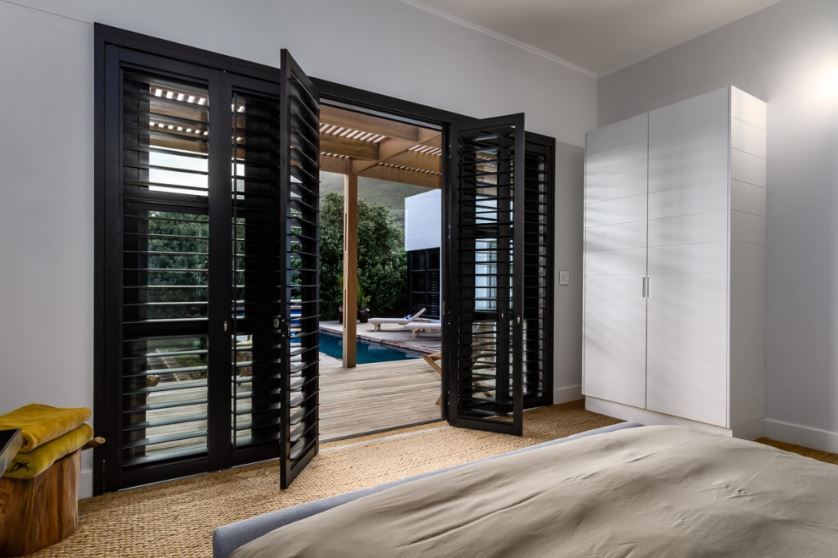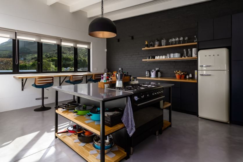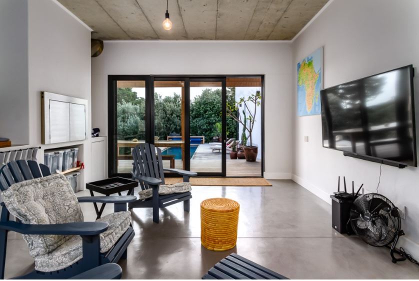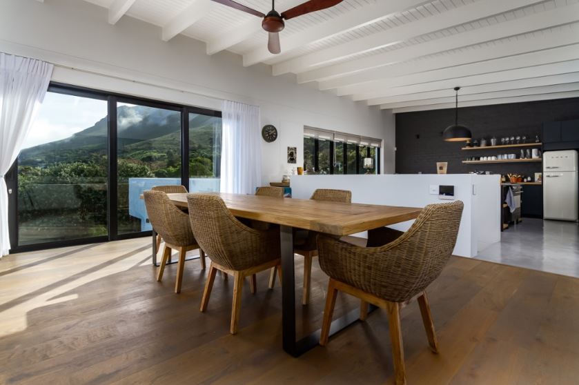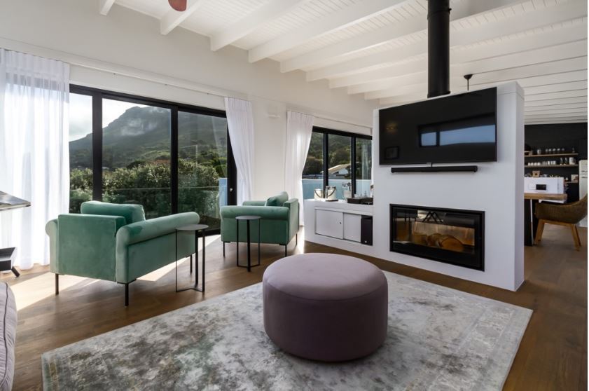 Spacious modern and light-filled living area upstairs with beautiful views of Chapman’s Peak. The open plan lounge, dining room and kitchen are furnished in style with a large central fire place. The kitchen is fully equipped with modern appliances, ready to prepare scrumptious holiday meals. An additional living area downstairs is perfect for entertaining with an indoor barbeque and TV, and sliding doors leading to the wooden pool deck, perfect for entertaining.