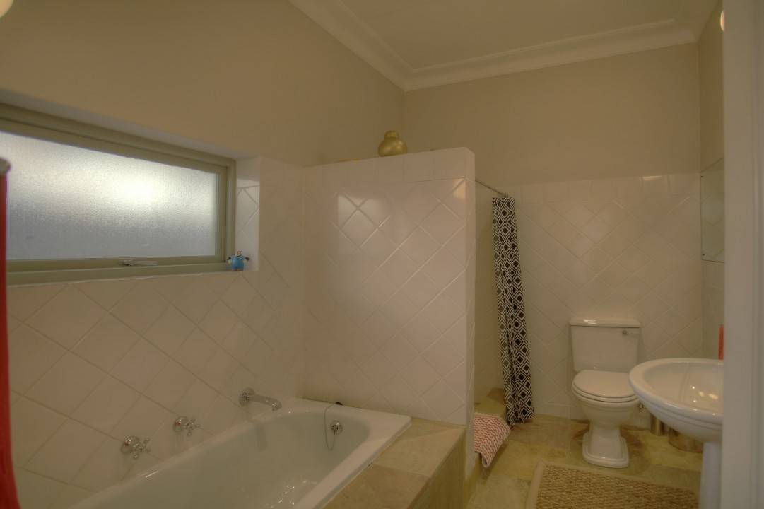 This bedroom leads out onto the garden and offers views of the ocean. On the 3rd level/top floor is the main bedroom with a queen size bed, walk-in closest and en-suite bathroom with shower and bath.