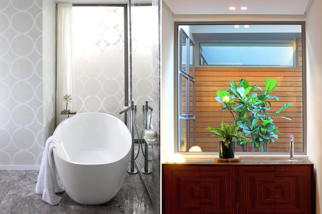 As a holiday destination Ravine offers an island feel, a look that is mirrored in the interiors with its anthracite, charcoal and purpley granite shades offset with pots of orchids, frangipani, poinsettia, a Catherine Wheel of colours shot with scarlet accessories.