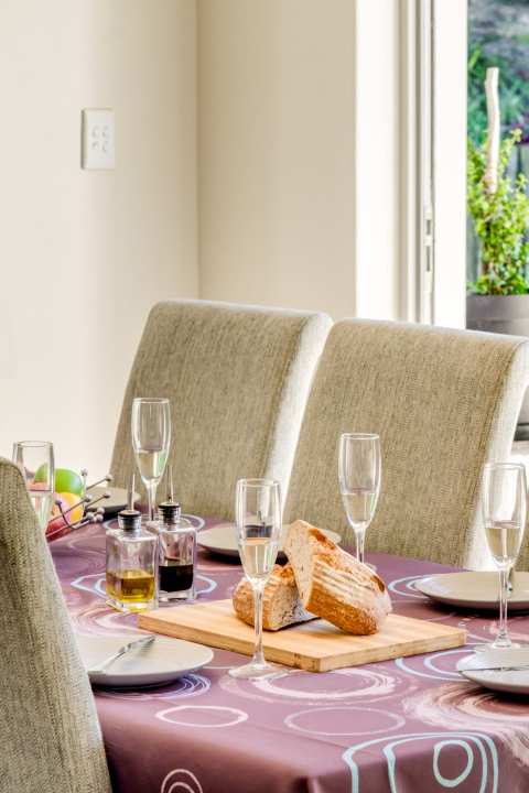 Perfect for culinary enthusiasts, the fully equipped kitchen features a gas hob, Nespresso machine, dishwasher, and a breakfast bar for four. A separate laundry room with a washer and dryer adds convenience for longer stays. The kitchen flows seamlessly onto the pool terrace and garden — ideal for easy indoor-outdoor living.