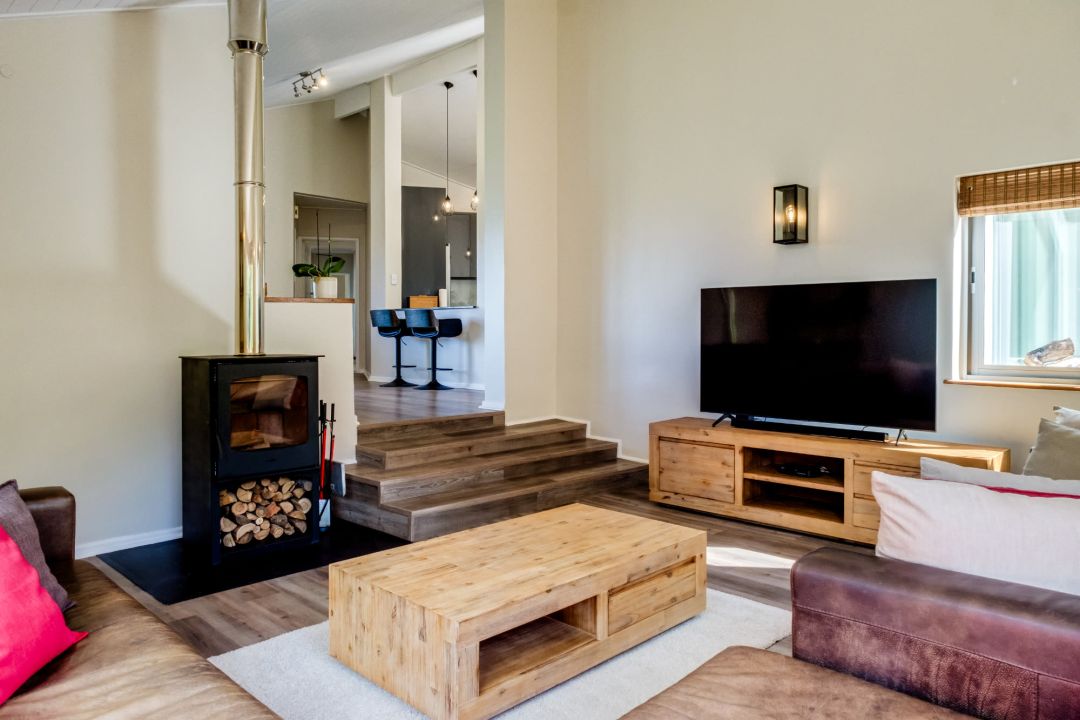 The heart of Rivendell is its inviting open-plan living and dining area, complete with a wood-burning fireplace, plush seating, and a dining table for eight. Large windows frame the surrounding mountains, creating an ever-changing natural backdrop. Adjacent, a TV lounge with a mini-fridge and private study nook offers a cosy spot for quiet moments or entertainment.