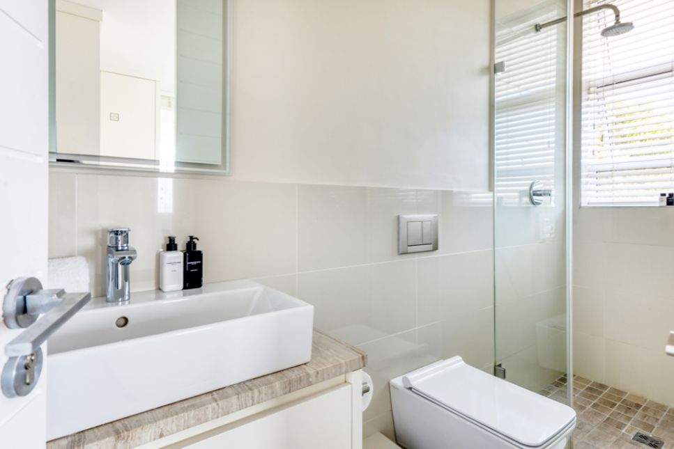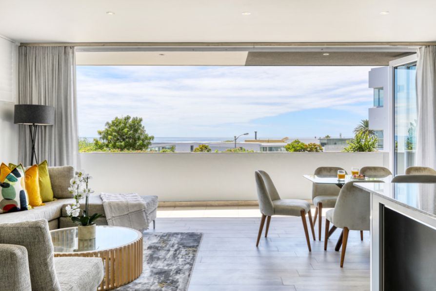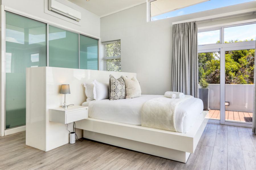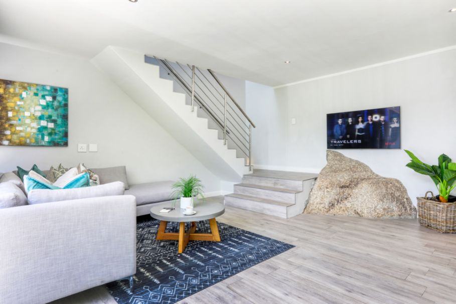 As you enter the property you walk into the open plan living room, dining and kitchen area. This level also offers a guest bathroom. The kitchen has been fully equipped with all you could possibly need for you holiday including dishwasher, washing machine, dryer, microwave. The dining table seats 6 guests. There is also an L-shaped couch and flat screen TV with DSTV access. There is a smaller terrace leading off the living room with views towards the sea.