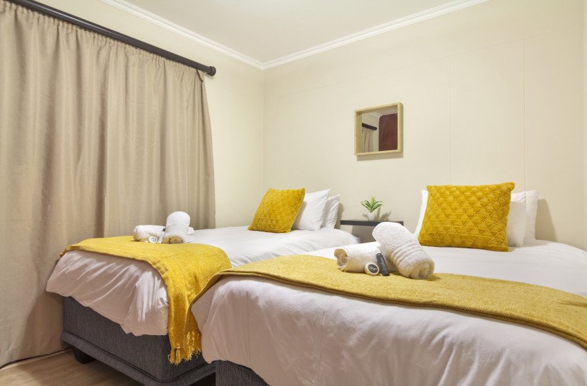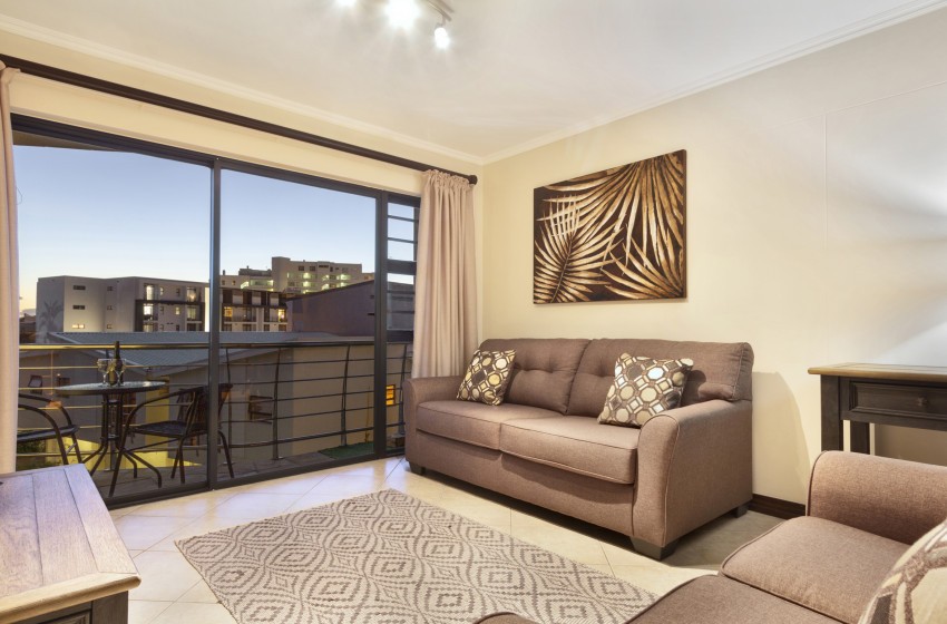 The apartment has an open-plan design featuring a fully equipped kitchen for easy self-catering and a lounge with a large flat-screen TV where guests can curl up and binge their favourite series with a mountain of snacks. The lounge leads to a furnished balcony overlooking the area – there is no better place to enjoy a beautiful Cape Town sunset. The main bedroom has a queen bed, floor-to-ceiling windows for ample natural light and an en-suite bathroom featuring a shower. The second bedroom has 2 single beds, accessing the shared bathroom featuring a shower.
