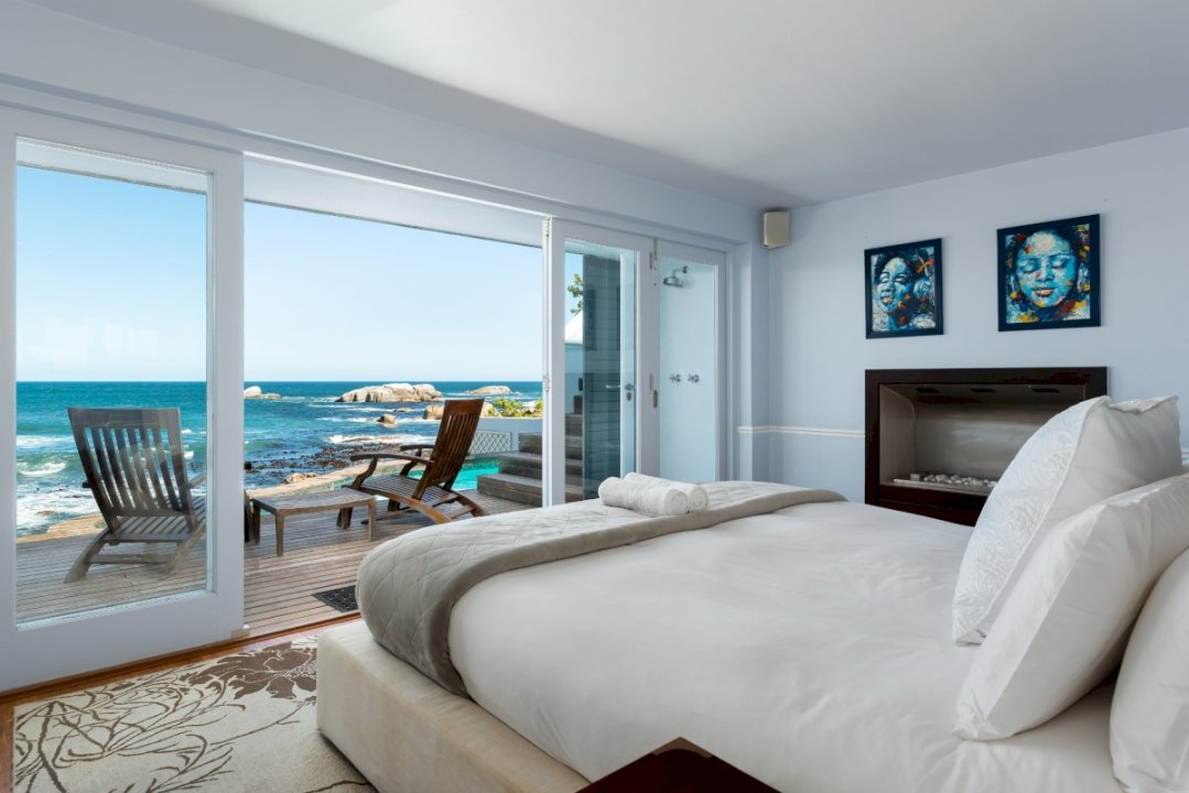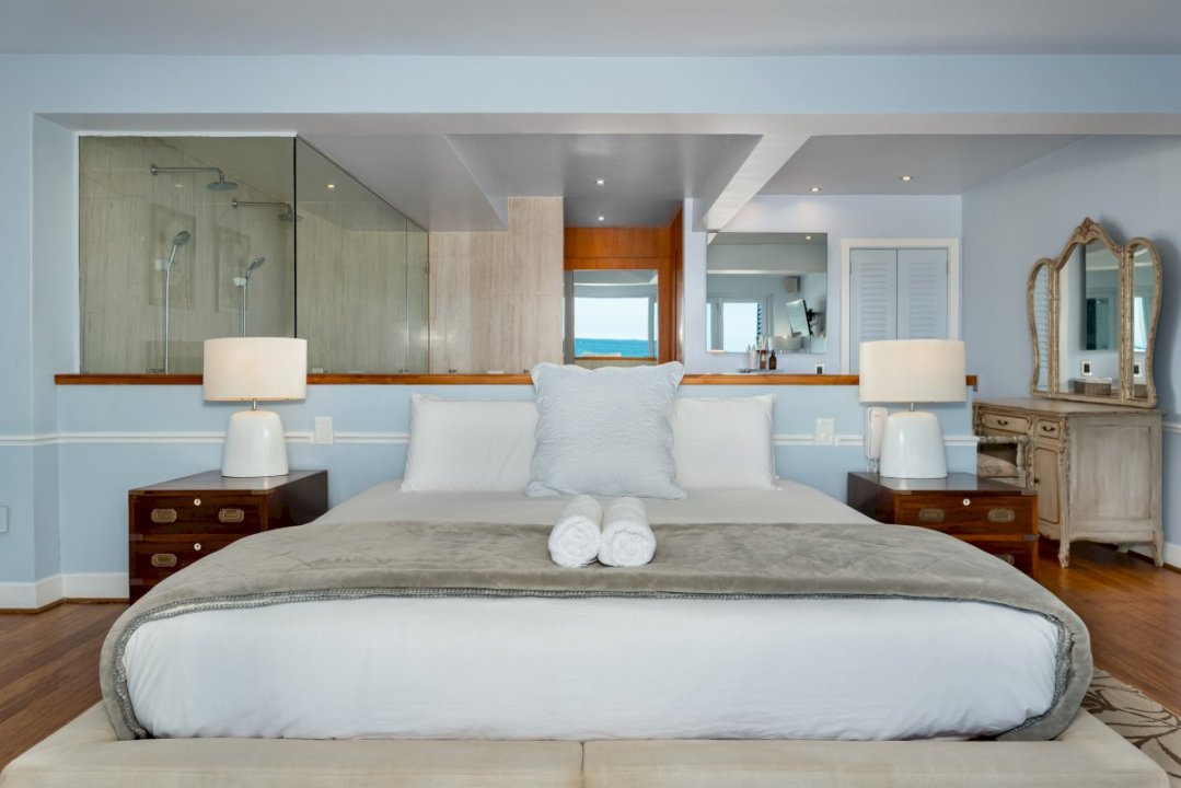 – A king-size bed positioned to gaze over the pool deck and onto the vast