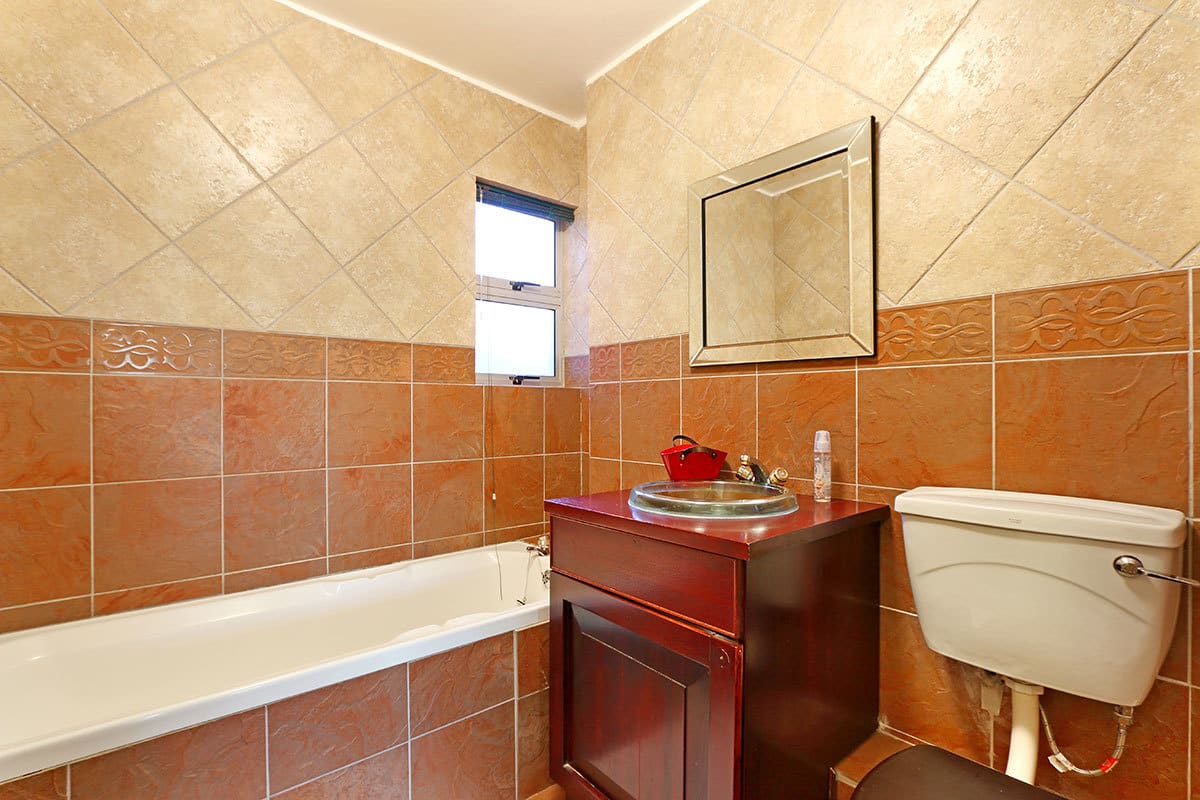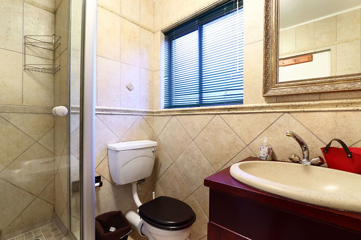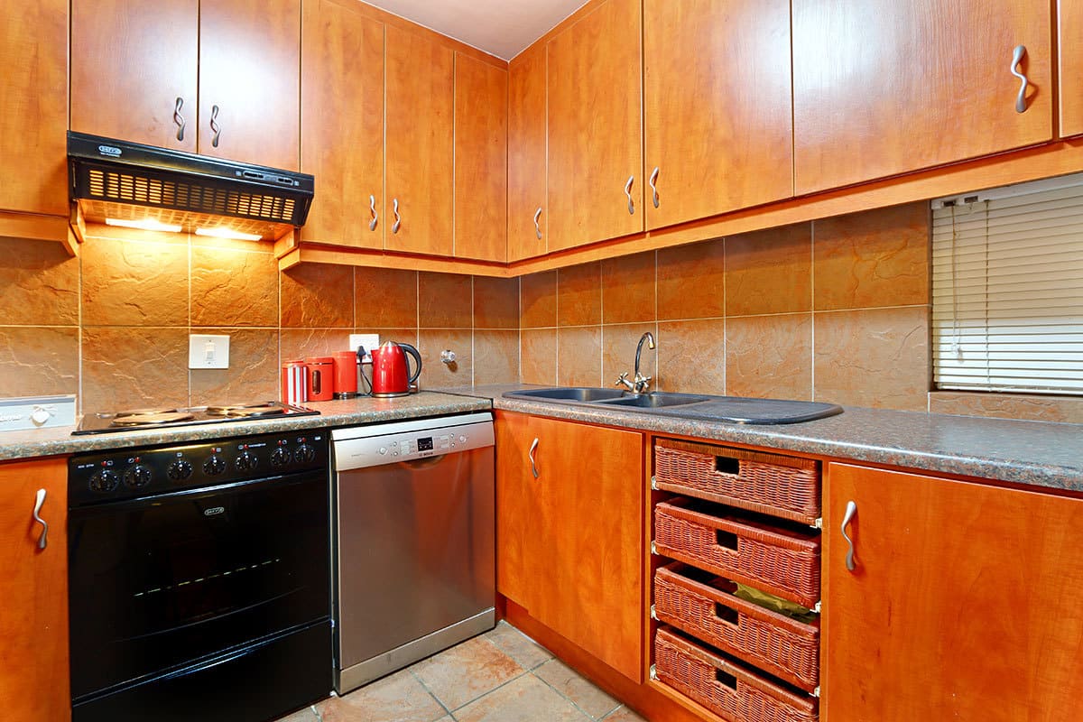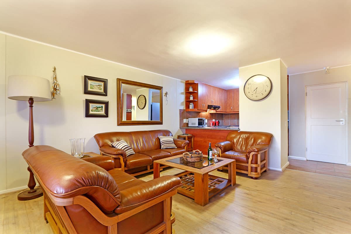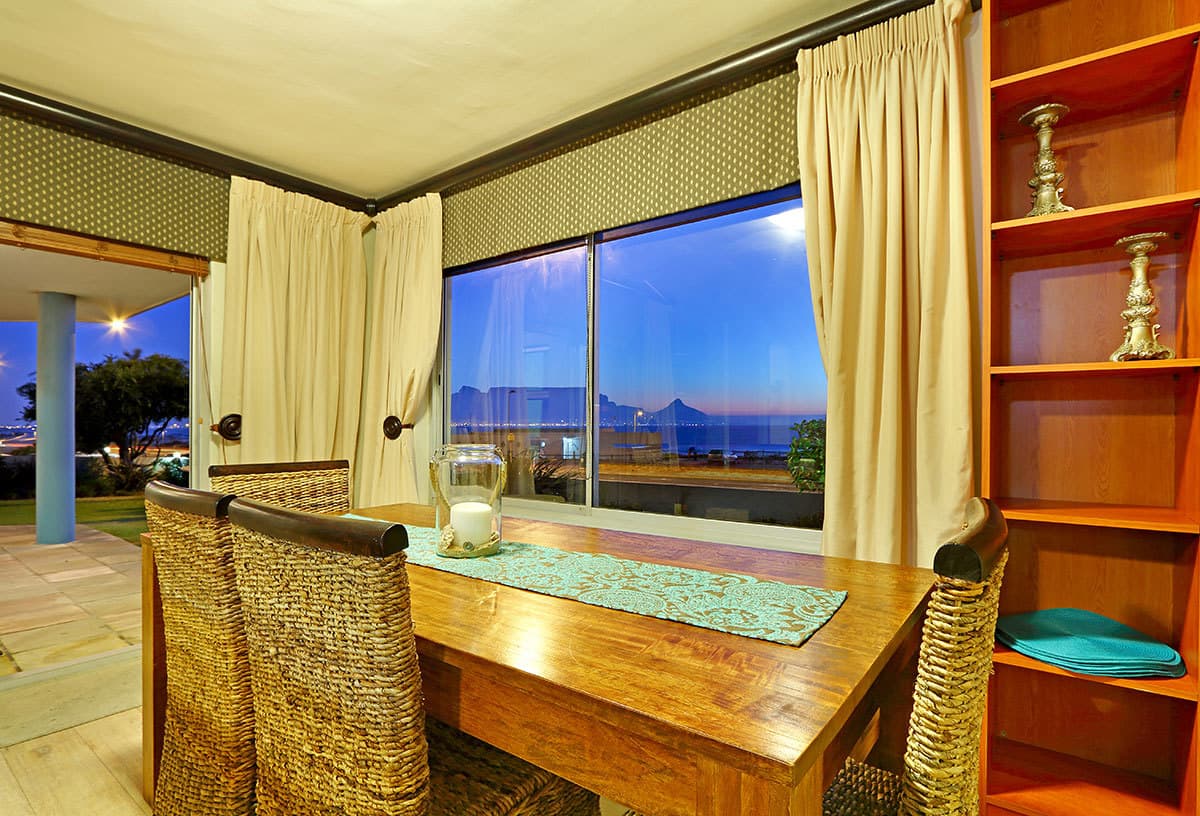 The main interior consists of an open-plan arrangement that comprises of the kitchen lounge and dining area. The charming and fully equipped kitchen includes among other features a fridge, coffee plunger, oven, microwave, toaster, kettle and dishwasher. The lounge, with 3 couches, seating 1, 2 and 3 respectively, features a flat-screen TV with a DStv bouquet. The dining area, with seating for 6, leads out to an enchanting patio. The patio, with 6 chairs, offers guests breathtaking views of the ocean and Table Mountain and leads out to a luscious communal garden.