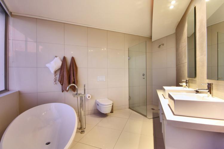 The main bedroom offers a large double bed and en-suite with an oval corner bathtub, twin basins and a separate corner shower.