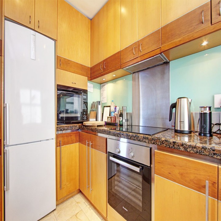 The three bedroom, three and a half bathroom apartment is larger than most three bedroom apartments as it was converted from two separate apartments and has been finished in a chic retro style with polished curved surfaces, luxurious wood and marbled finishes. The kitchen is fully equipped with appliances and all cookware needed for self catering, including a dishwasher, washing machine, dryer, for your convenience. Each of the three bedrooms has an en-suite and all the bedrooms has been decorated in neutral tones with a semi hotel feel.