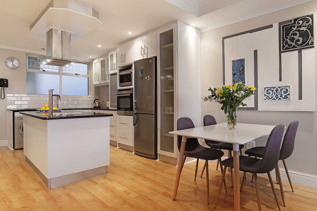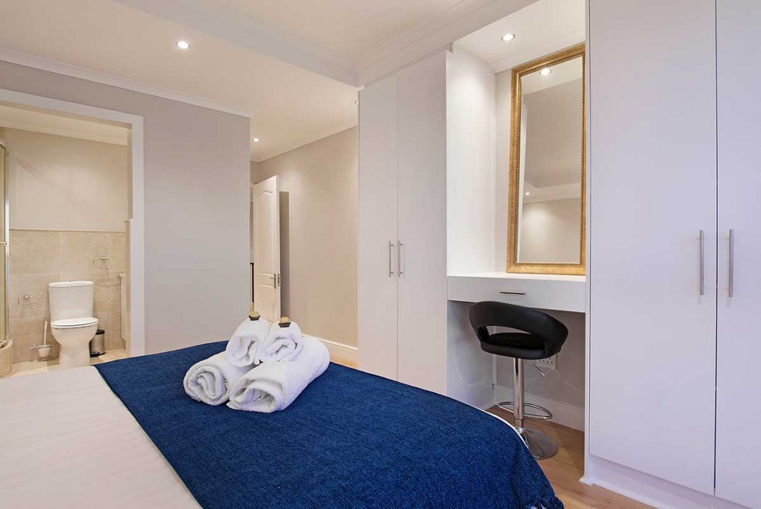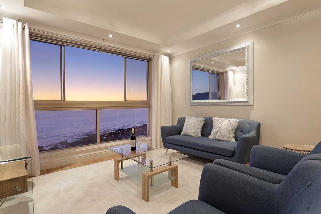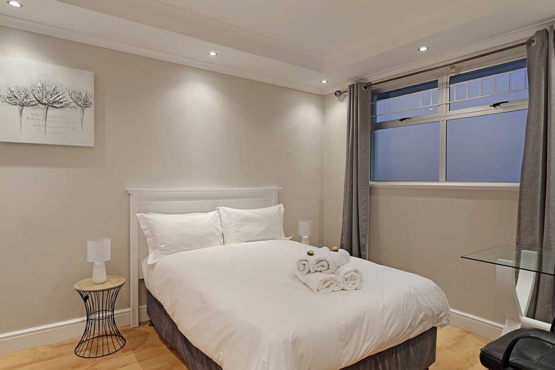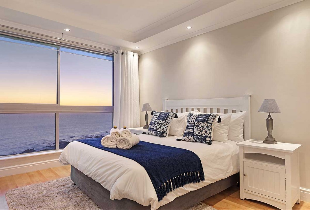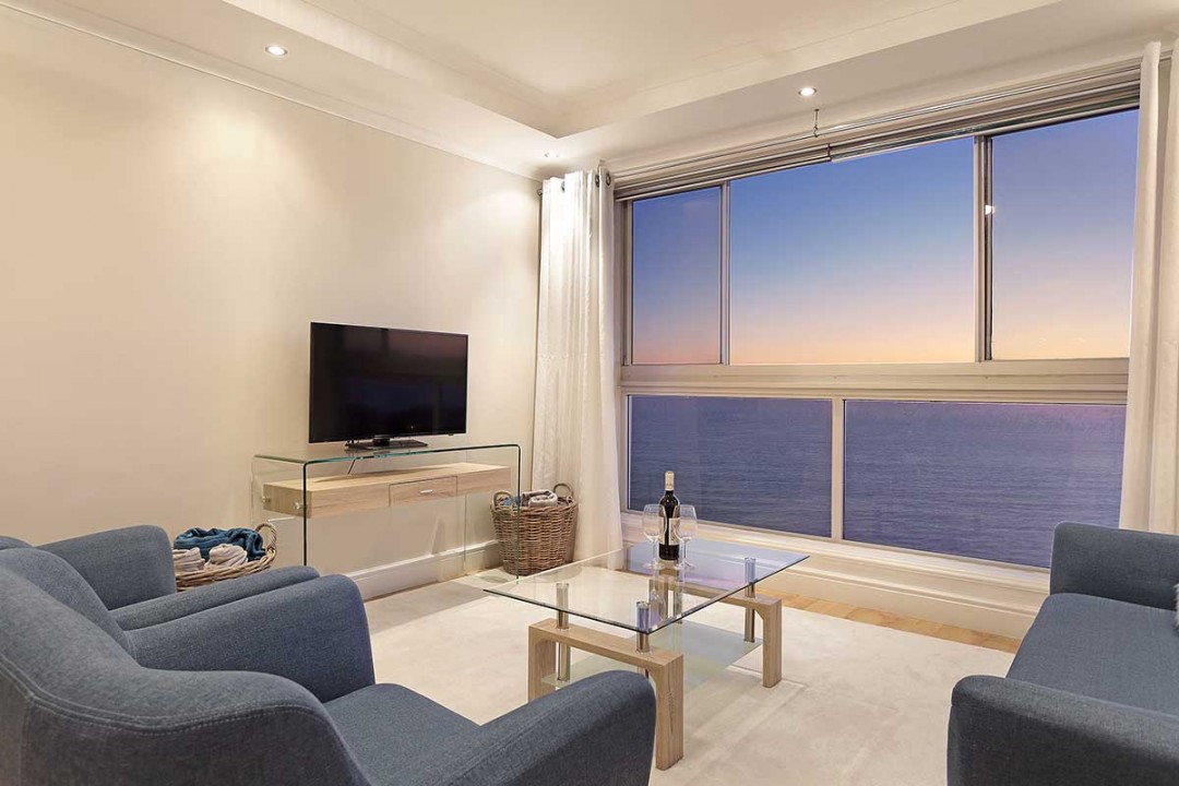 This two bedroom self catering apartment is equipped with everything you need for a relaxing holiday. The airy, open plan kitchen is fully equipped and boasts a Nespresso machine. A dining table that comfortably seats 4 people is the perfect spot to enjoy a home cooked meal. The lounge is equipped with a flat screen TV and sweeping views of Table Mountain, Robben Island and the Atlantic Ocean.