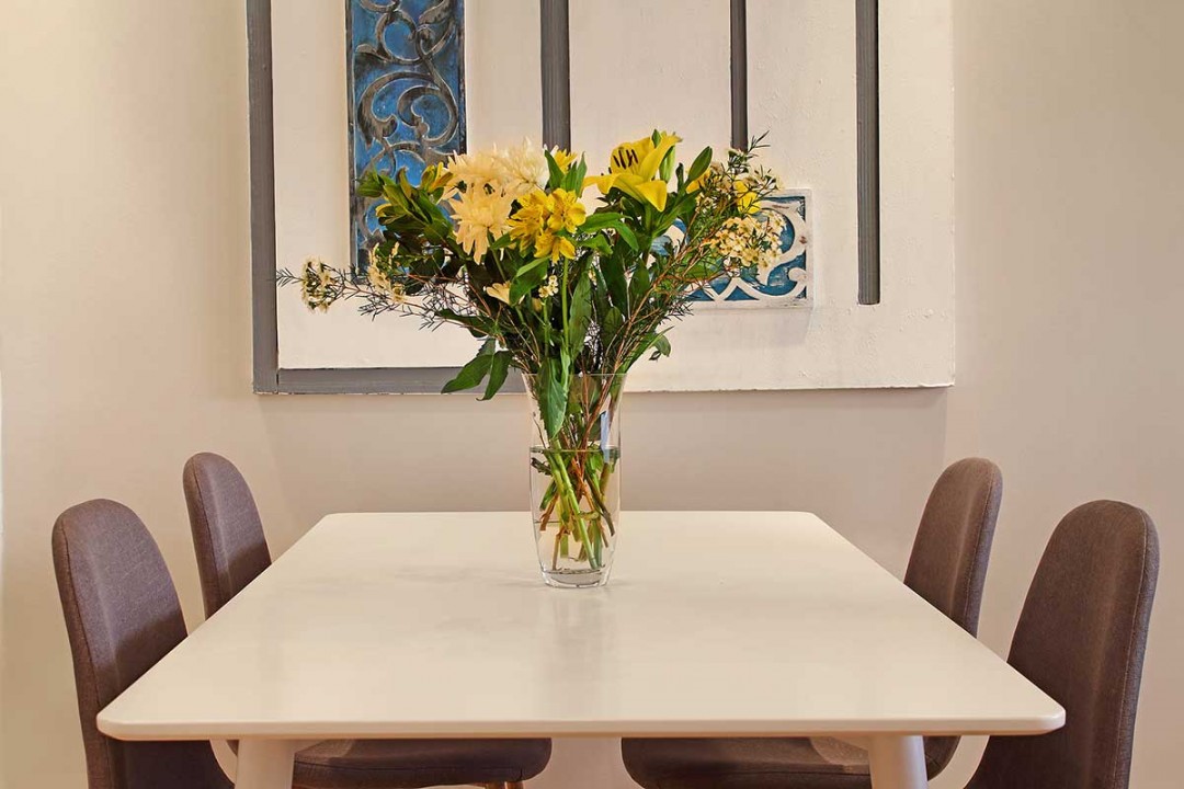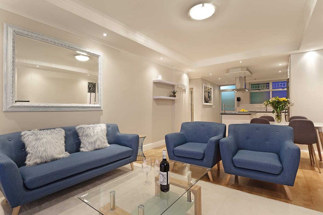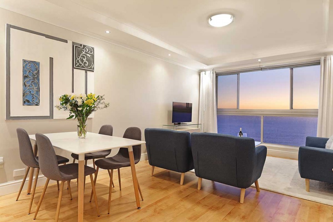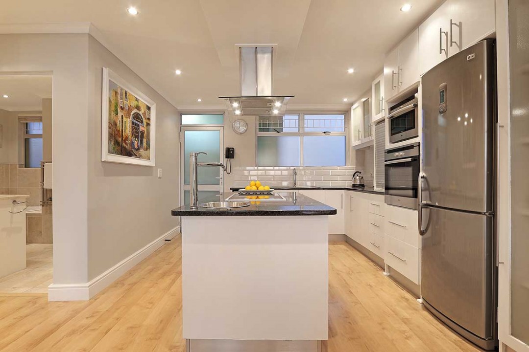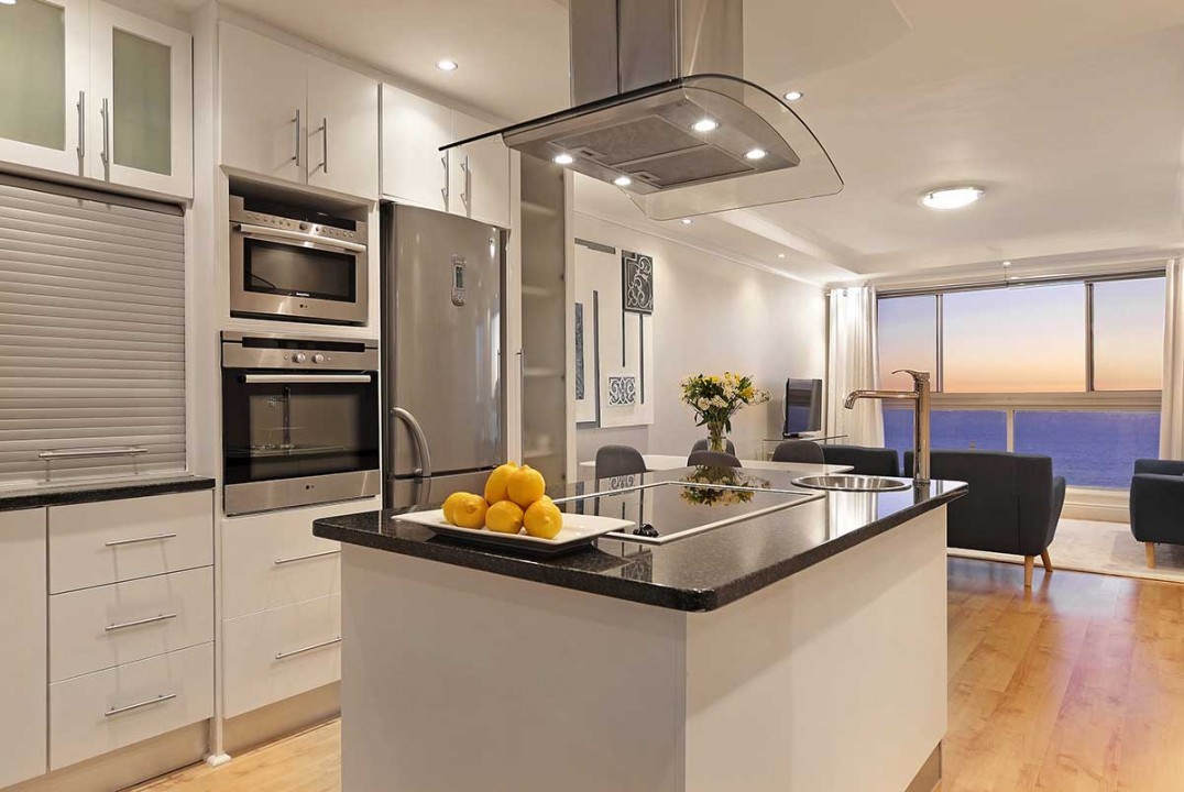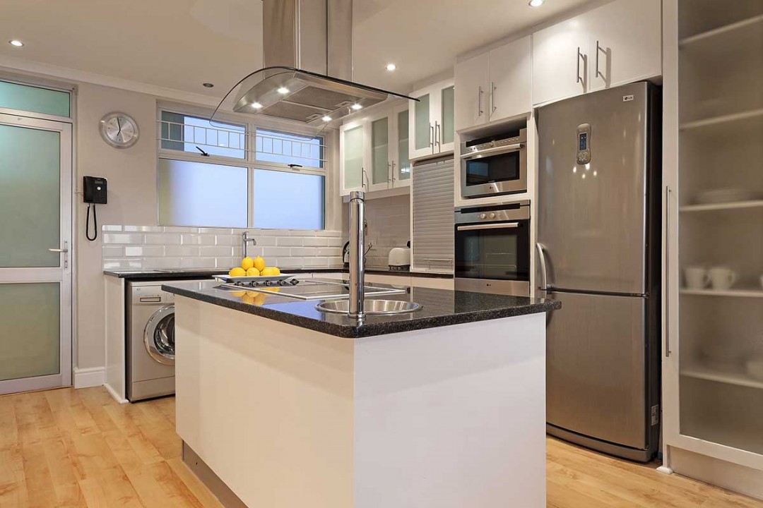 This two bedroom self catering apartment is equipped with everything you need for a relaxing holiday. The airy, open plan kitchen is fully equipped and boasts a Nespresso machine. A dining table that comfortably seats 4 people is the perfect spot to enjoy a home cooked meal. The lounge is equipped with a flat screen TV and sweeping views of Table Mountain, Robben Island and the Atlantic Ocean.