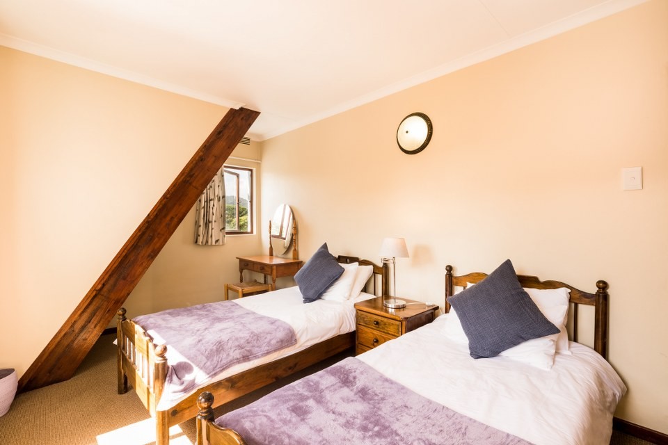 This double-storey Garden Route Family & Pet-Friendly Holiday Home offers four bedrooms sleeping up to 8 people comfortably. Upstairs are three rooms and separate bathroom; downstairs is the fourth room, en-suite with additional, separate bathroom.