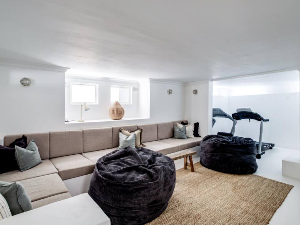 Fitness enthusiasts will appreciate the dedicated TV room and gym area, complete with two treadmills and a spinning bike. The fully equipped kitchen features a gas hob, wine fridge, and a separate laundry room, ensuring every convenience for extended stays.