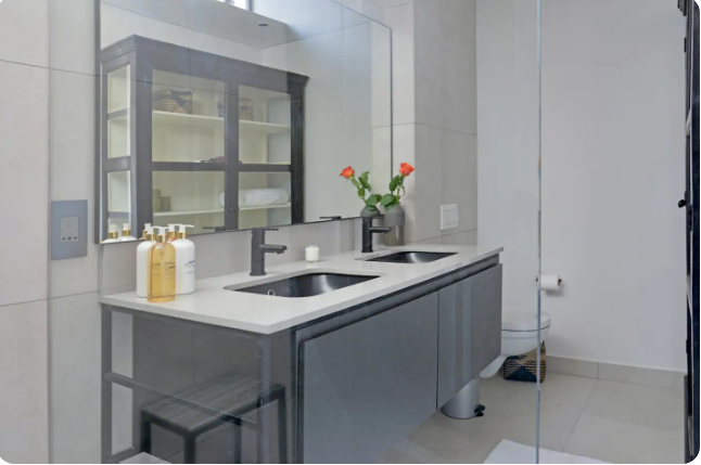The bedrooms are on either side of the living area. The second bedroom is adjacent to it’s bathroom. Both bathrooms have a rainfall walk-in shower and the en suite master bathroom has a double basin.