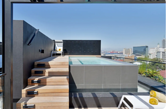 From the living area one is transported up an internal staircase to your own PRIVATE ROOFTOP POOL TERRACE. Be prepared to to be blown away by the 360° view of Cape Town. This is the jewel in the crown. Relax on the sun loungers or just enjoy sundowners from the bar fridge and watch the sun set behind Lion’s Head. Follow sundowners with dinner around the table on the deck with the lights of Cape Town to entrance you.