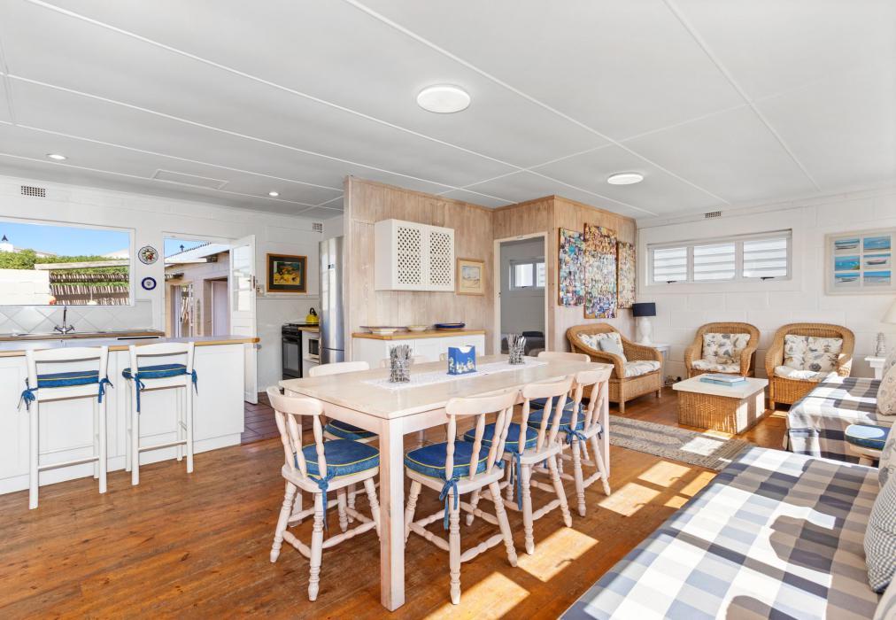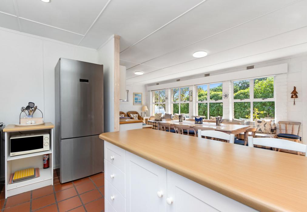 The heart of the home is the open-plan living area, styled with coastal touches that reflect the surrounding seaside environment. The lounge offers comfortable seating for unwinding after a day out, while the dining area creates a cosy space for shared meals.