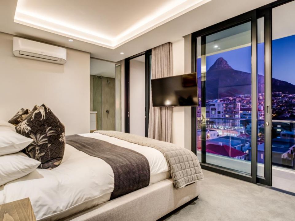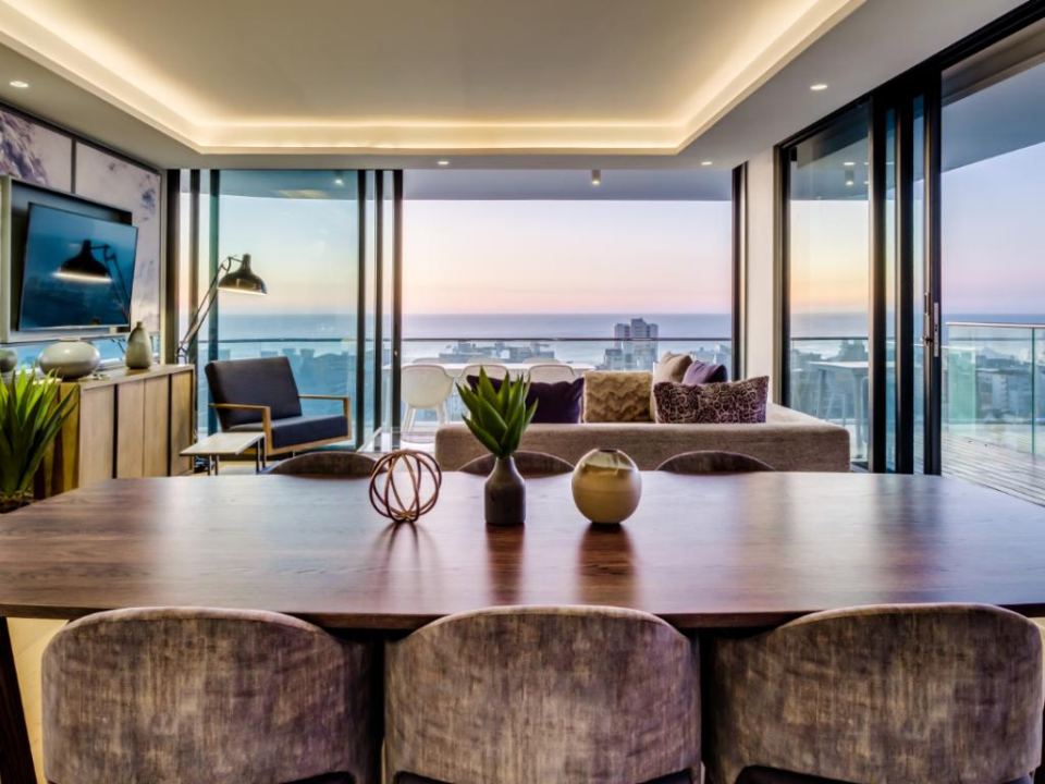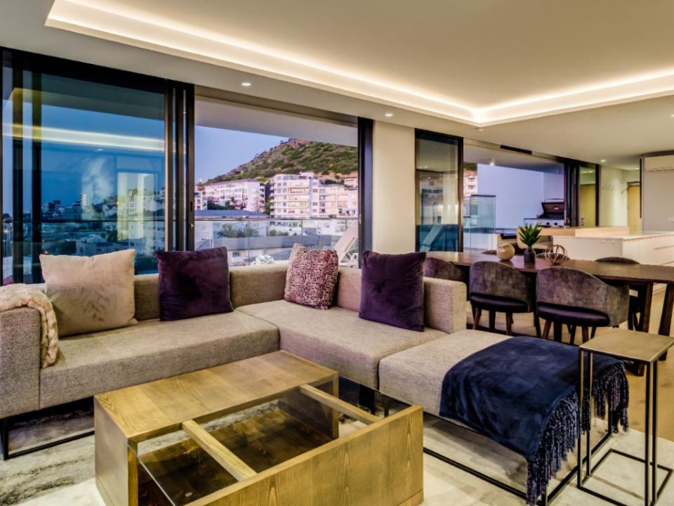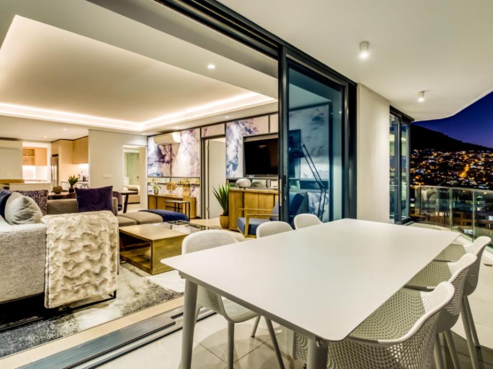 Visit this incredible city penthouse with panoramic views and luxury interiors. This penthouse apartment is fully equipped with all modern appliances and comforts for a brilliant stay in Cape Town. The lounge area has a large TV and plush seating, perfect for a movie night in. The dining space is light and spacious and both these areas lead onto the private balcony. The kitchen has all you will need for a holiday rental. The master and second bedrooms have TV’s and access to the balcony. All the bedrooms have their own bathrooms and aircon. This apartment makes for an incredible stay in Cape Town, relax in luxury while enjoying the beautiful city and ocean views.