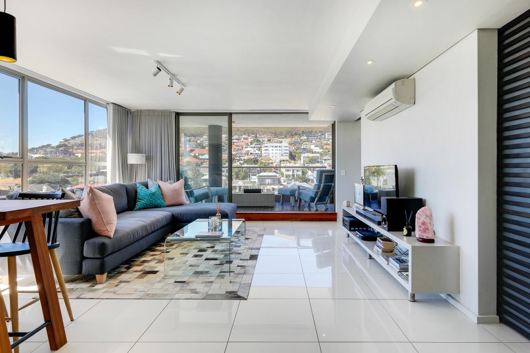 A open plan bright and light living area with floor to ceiling windows with air-conditioning and sliding doors leading to a decked terrace with luxurious outdoor furniture to enjoy view of the mountain. Beautiful glass dinning table and L-shaped luxury sofa, Flat screen TV includes Basic package DSTV.