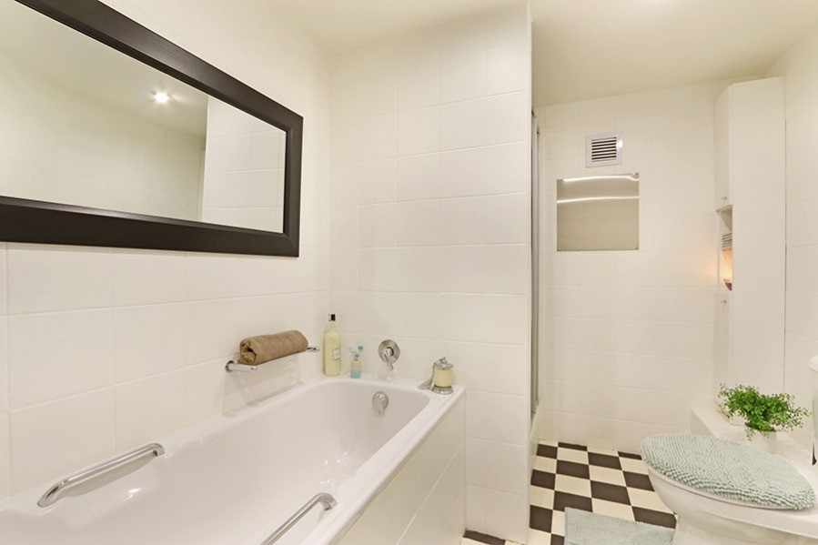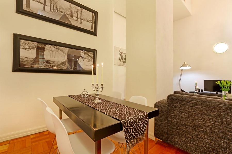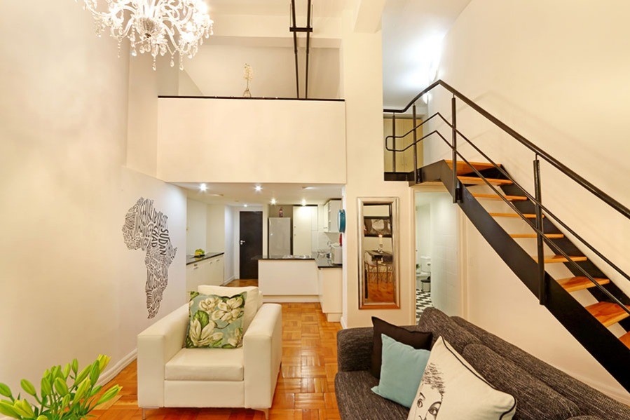 In Art Deco style of this building, there’s a mezzanine floor bedroom overlooking the open-plan lounge and fully functional kitchen with washing machine.