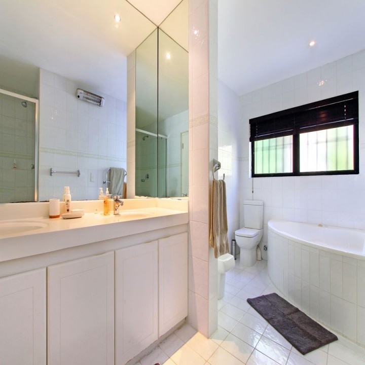3rd bedroom – queen size bed with views and airconditioner. Shares bathroom with bedroom 2. Bathroom includes bath and shower
