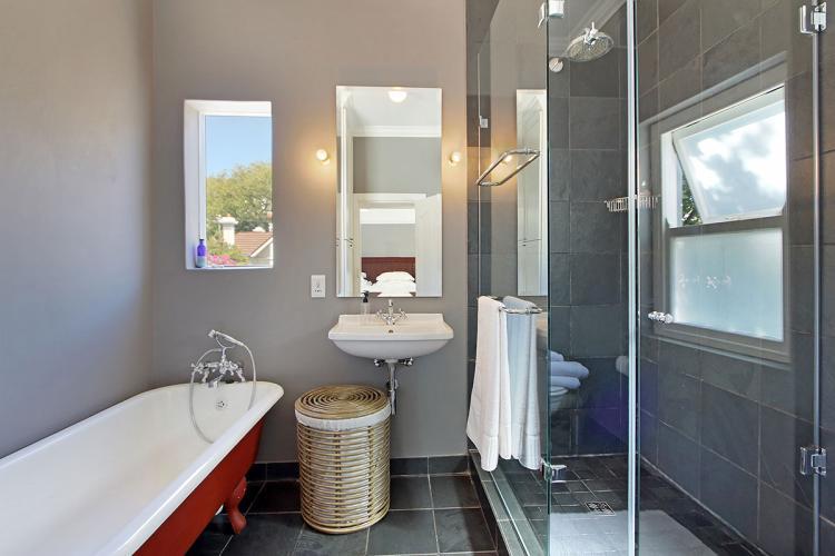 The main bedroom with en suite bathroom is upstairs. The main bedroom has a huge bed and the en suite has a separate shower and bath. The main bedroom is also air-conditioned. There are views of Signal Hill and a small Table Mountain view from upstairs.