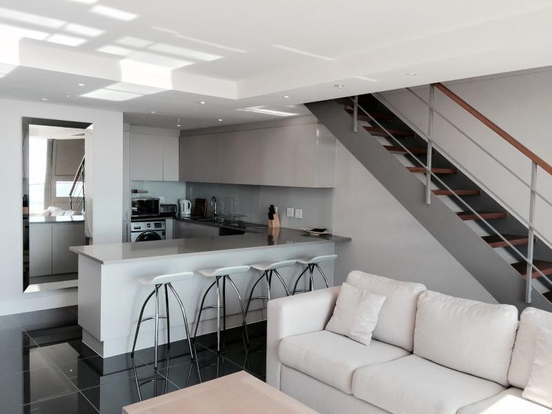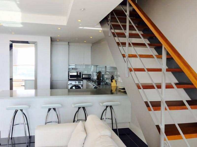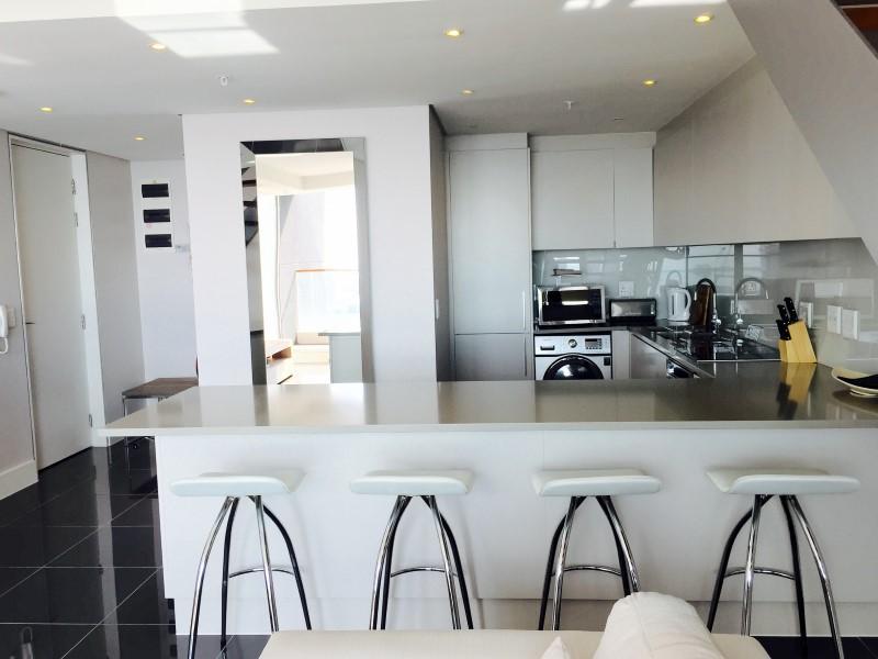 The entrance level of the apartment, offers an open-plan kitchen with breakfast bar area and guest loo, as well as the lounge with a 42″ LCD TV, complimented by full DSTV(Cable TV) bouquet. The lounge enjoys a great view of the happenings below and offers you, the guest, the opportunity to enjoy the Cape Town with a birds eye view in true comfort.