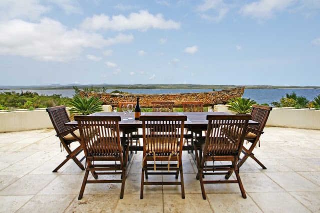 The terrace has a table seating 8 (photo), a ‘waiter’s window’ connecting to the kitchen, a stone oven, portable gas braii and provides access to the pool and lagoon.