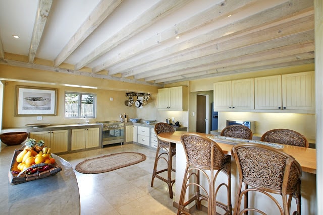 The entrance hall has a dining table seating 10 (photo), connects the lagoon and mountain facing sides of the house, the two downstairs bedrooms and the kitchen and dining room.