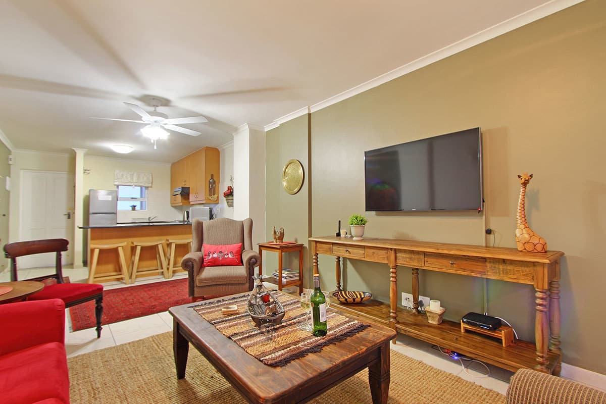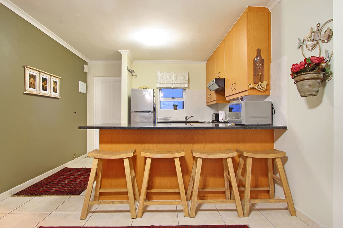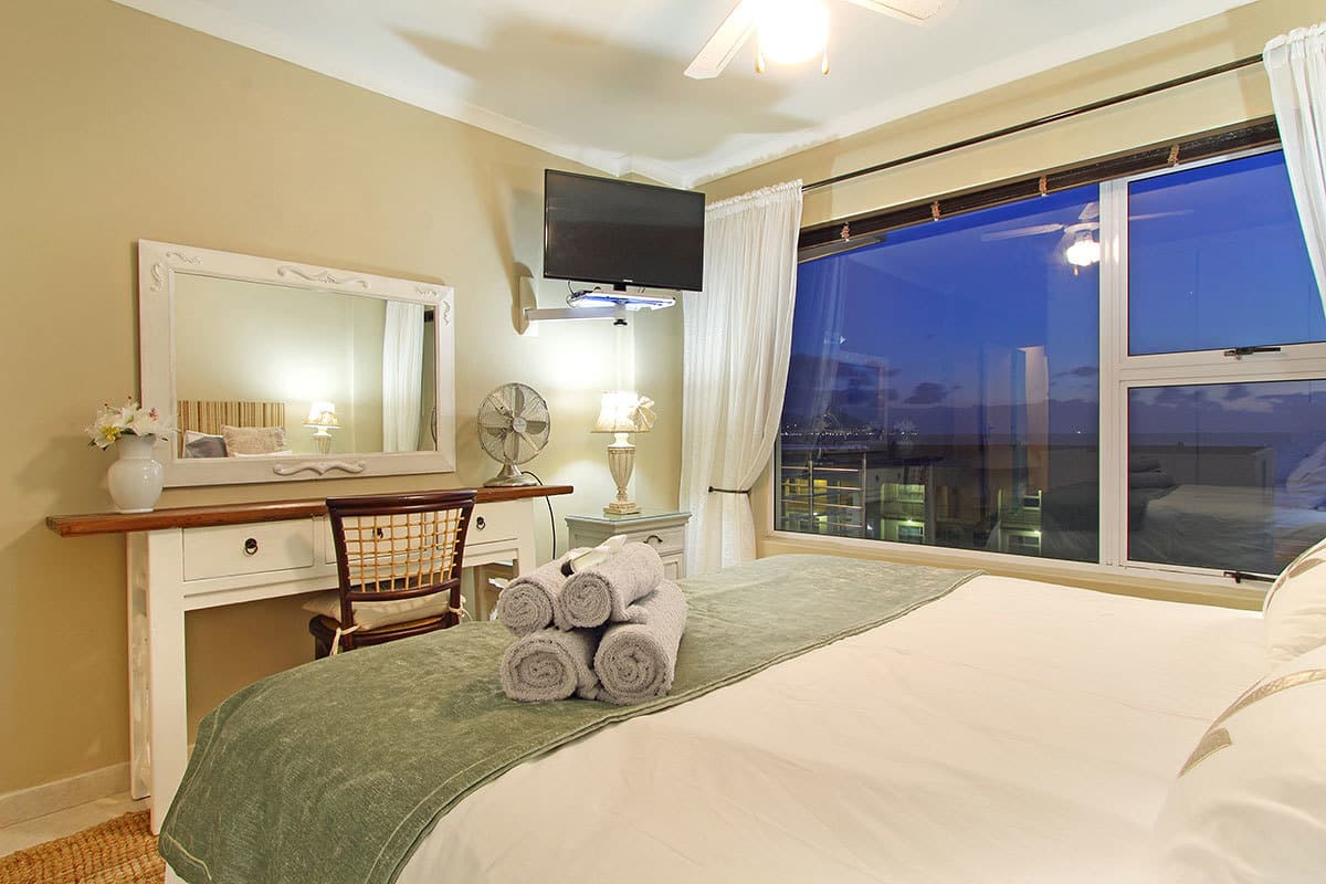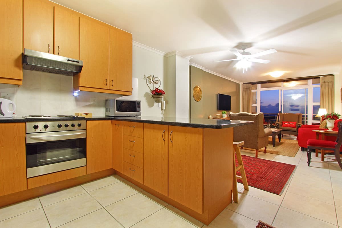 The elegantly furnished living area features a flat screen TV with DSTV. From here you can access the pleasantly furnished balcony where you can relax with a sundowner as you gaze at the twilight over the Atlantic Ocean. The fully stocked kitchen will set you up for a pleasurable self-catering stay while you reside in the number 1 holiday destination in the world.
