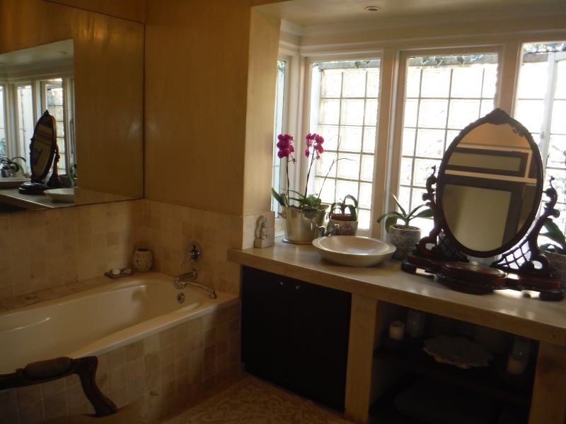 This inside open plan living area leads onto a fantastic outdoor lounge patio which is an upper deck area with an umbrella and deck chairs for sun tanning. A few stairs down from the patio is a little garden with the perfect sized swimming pool which gets plenty of sunlight. There are 3 bedrooms of which 2 are in the main house and the 3rd in a gorgeous cottage in the garden but all in close proximity.