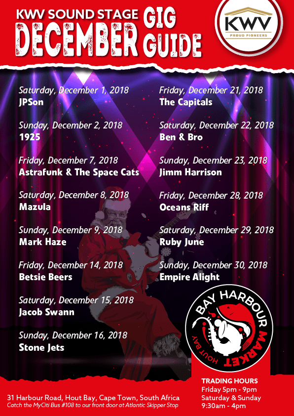 This December, KWV Sound Stage Gig features plenty of warm hearty music to keep you company at the Bay harbour Market. Don’t miss the Astrafunk & The Space Cats this Friday, Mazula on Saturday and Mark Haze on Sunday. Enjoy the amazing musical performances and creativity, great food and the vibey atmosphere of Bay Harbour Market. You’ll definitely have a great time this festive season!