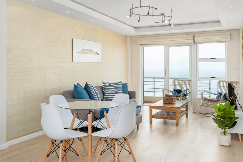 Open-plan Kitchen to Living Room, with Dining Room Table and comfortable loungers leading to the balcony that offers panoramic views of the South Atlantic Ocean & Table Mountain.
