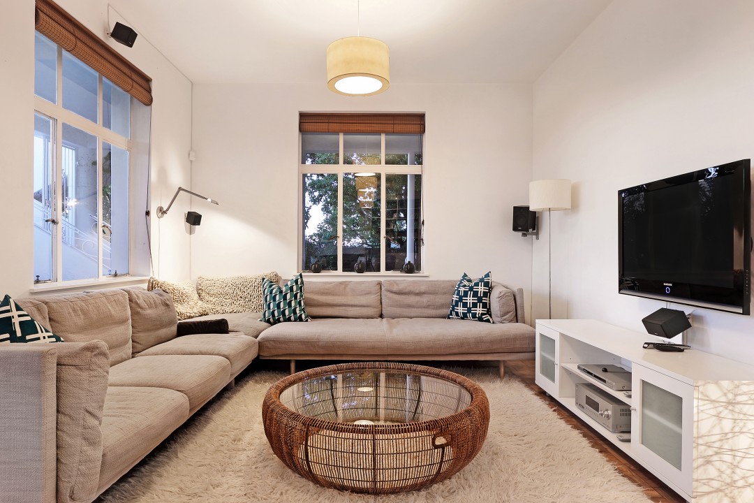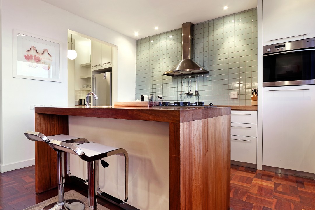 One enters the villa by walking through the peaceful front courtyard over a Koi pond into the spacious open plan living, dining and kitchen areas .