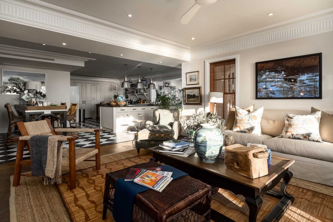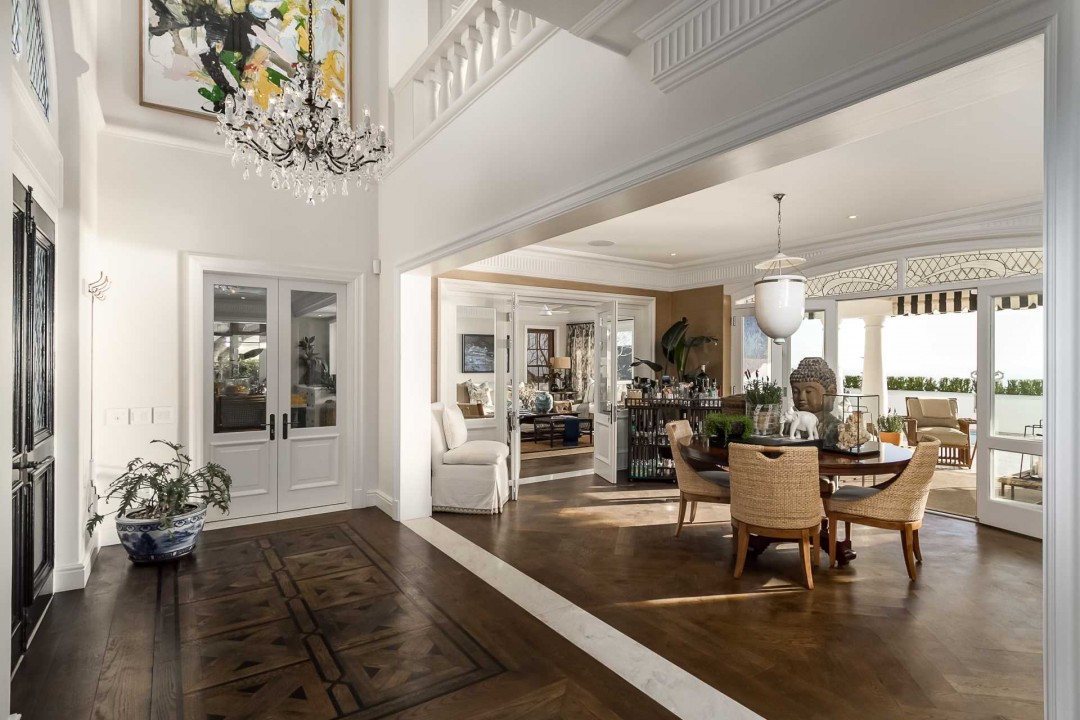 Chocolate-coloured parquet flooring flows through the entrance hall and into the lounge.
