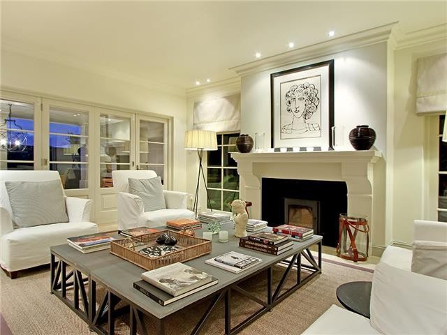 The decor is a classic aesthetic in a neutral palette, with loose covered chairs, seagrass rugs and antique french tables.