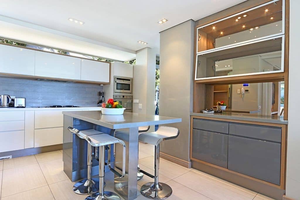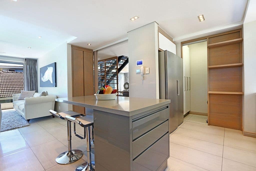 Modern fully equipped kitchen on the right with pantry and scullery (washing machine, hob, oven, refrigerator, freezer, dishwasher)