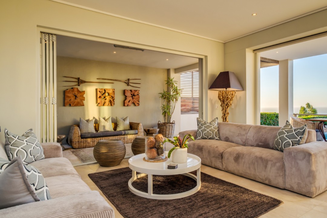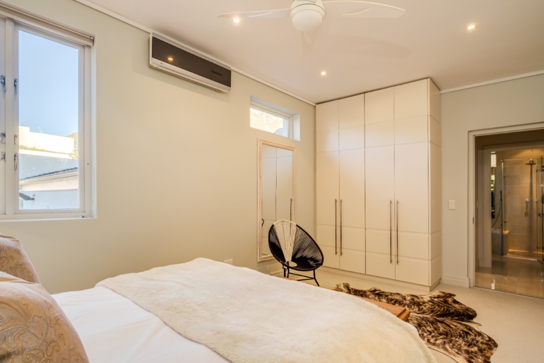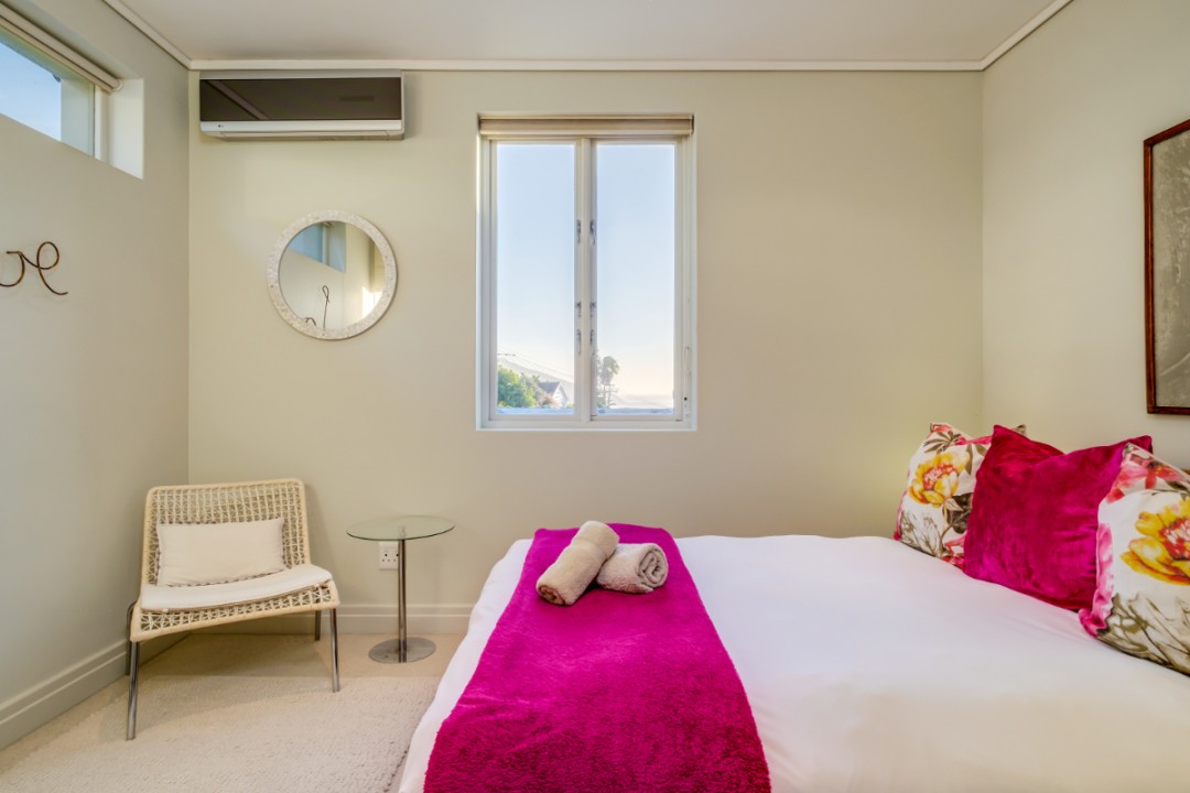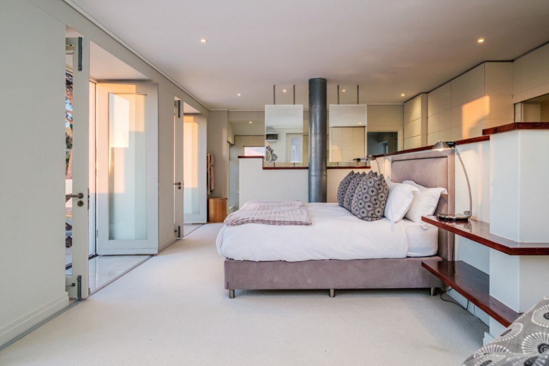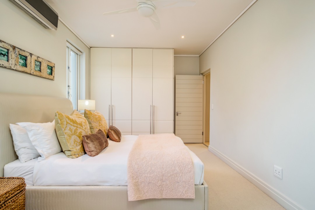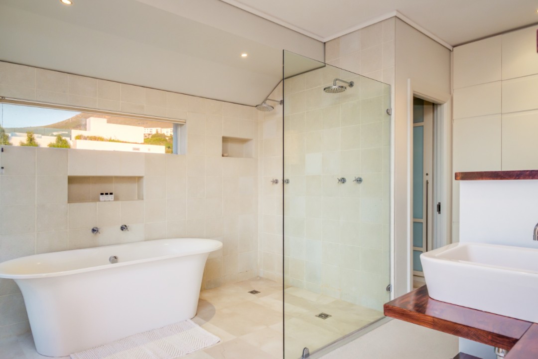 The upper level of the property features the bedrooms, made up of the master bedroom and three queen guest bedrooms. The vast master bedroom enjoys a king-sized bed, a beautiful, open plan en-suite bathroom with twin vanities, an oval soaking tub, a walk-in rain shower and heated towel rails. The master bedroom opens onto a private balcony with spectacular ocean views. The remaining three bedrooms have queen-sized beds, enjoy ample cupboard space, and share a bathroom with bath and shower. All bedrooms have to air-conditioning.