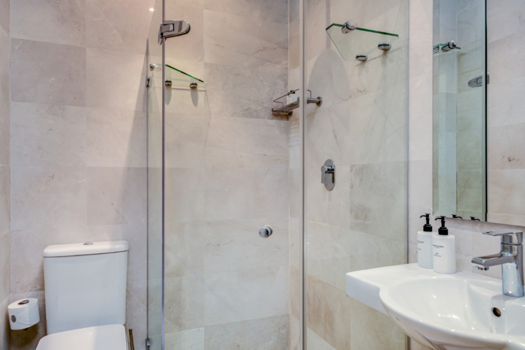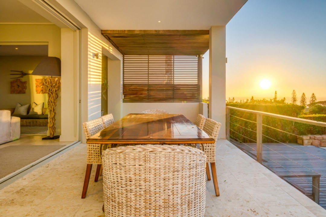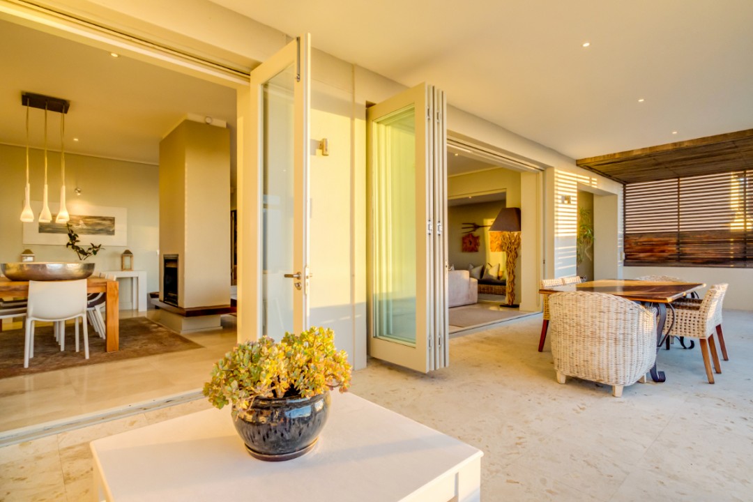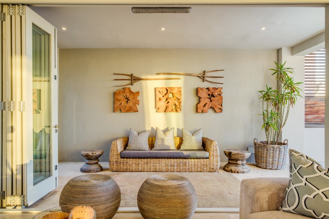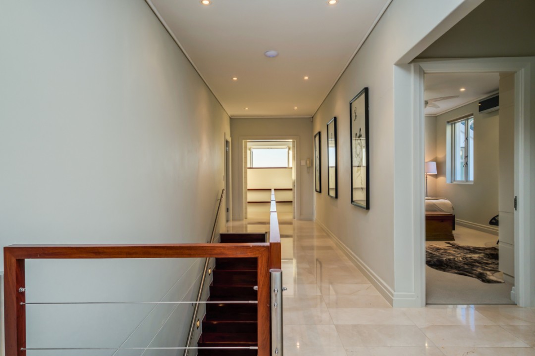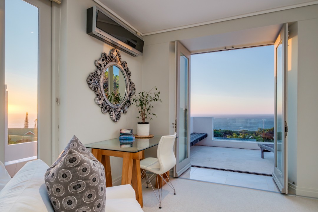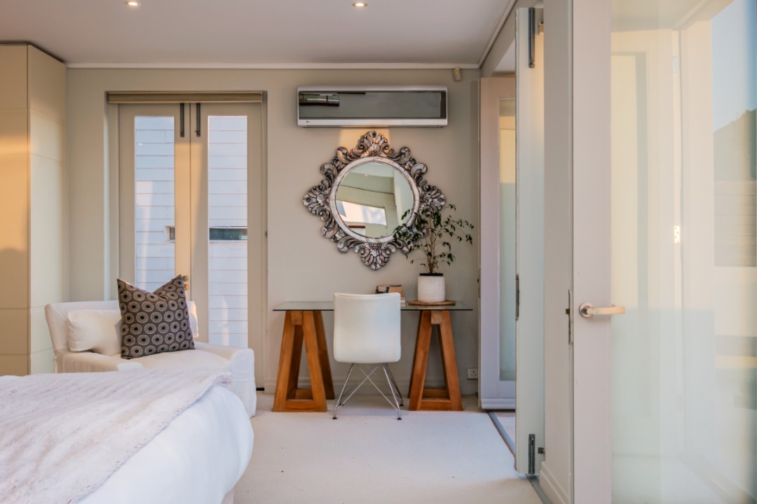 The upper level of the property features the bedrooms, made up of the master bedroom and three queen guest bedrooms. The vast master bedroom enjoys a king-sized bed, a beautiful, open plan en-suite bathroom with twin vanities, an oval soaking tub, a walk-in rain shower and heated towel rails. The master bedroom opens onto a private balcony with spectacular ocean views. The remaining three bedrooms have queen-sized beds, enjoy ample cupboard space, and share a bathroom with bath and shower. All bedrooms have to air-conditioning.