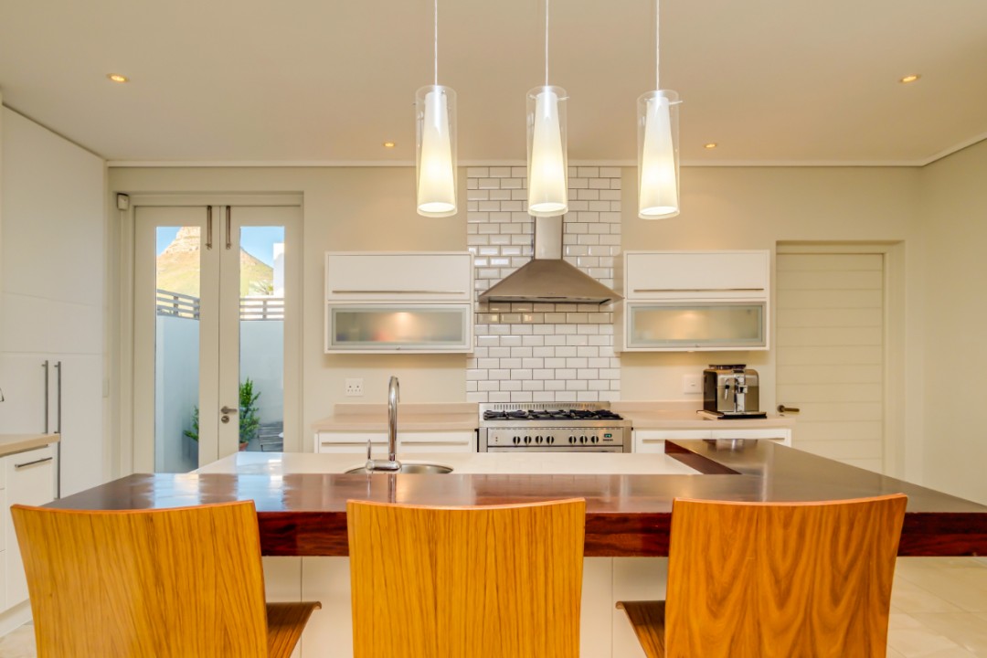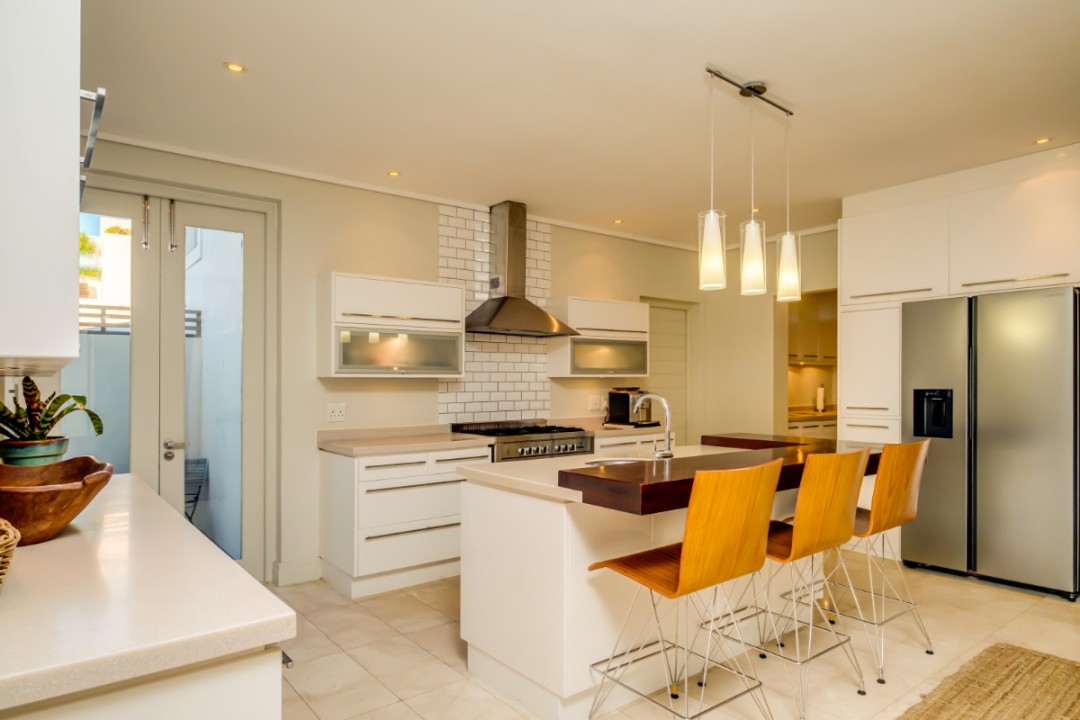 A modern, kitchen features state-of-the-art amenities, including a gas/electric combination oven and stove, double fridge with ice-maker, walk-in pantry, and separate scullery with washing machine, tumble dryer, and dishwasher. A sleek breakfast bar with three stools is ideal for casual meals, and double doors open onto a small courtyard with a table and chairs for sunny mornings.