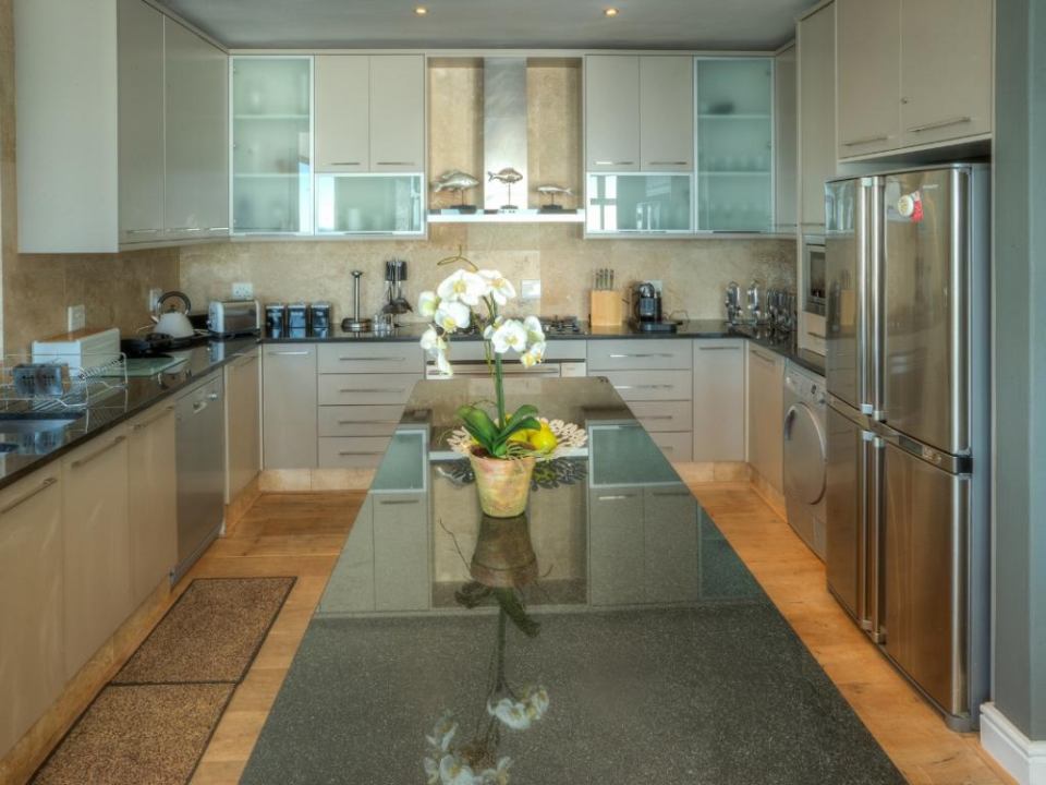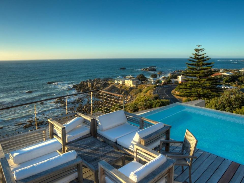 A well-designed duplex penthouse, styled in cool whites and natural finishes, invites relaxation and is the perfect retreat for serene holidays. A funicular takes you up to the front door of the property. The entrance and ground level of the property features two of the three en-suite bedrooms. These are immediate to your right as you enter this magnificent home. As you make your way into the entrance hall, several steps lead down into the sunken lounge and open-plan living room, dining room, and kitchen. The Master bedroom leads off to the living room and shares a decked balcony that wraps around the property back to the living room and kitchen. On the upstairs level, you will find a stylish family room and indoor bar. These seamlessly lead onto the large, elegantly furnished roof deck from which you will enjoy a 360-degree view of the Atlantic Ocean, Table Mountain reserve and Twelve Apostles, and your private pool.