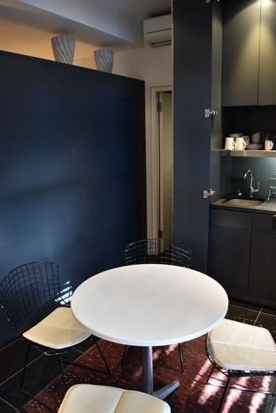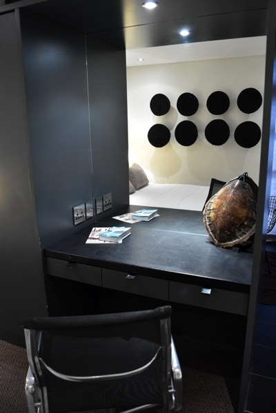 The large air-conditioned bedroom area has a desk and television, the cupboards divide this space from the four seater dining table and entrance. Further cupboards hide the kitchenette with sink, microwave, kettle & toaster. The en-suite shower bathroom leads off from this room.
