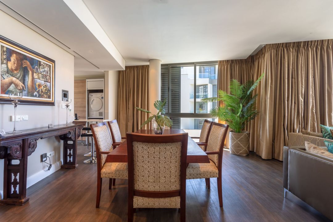 The apartment offers three elegant bedrooms and three modern bathrooms, including a main en-suite with bath and shower. Each room can be configured as twin or king beds, making it ideal for families, couples, or colleagues travelling together.