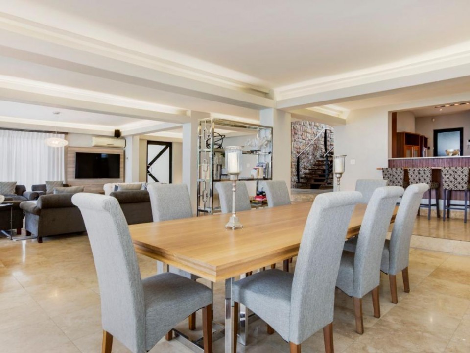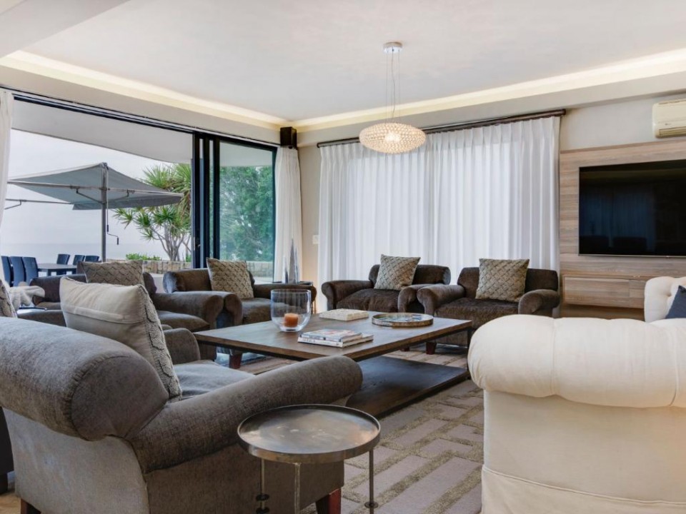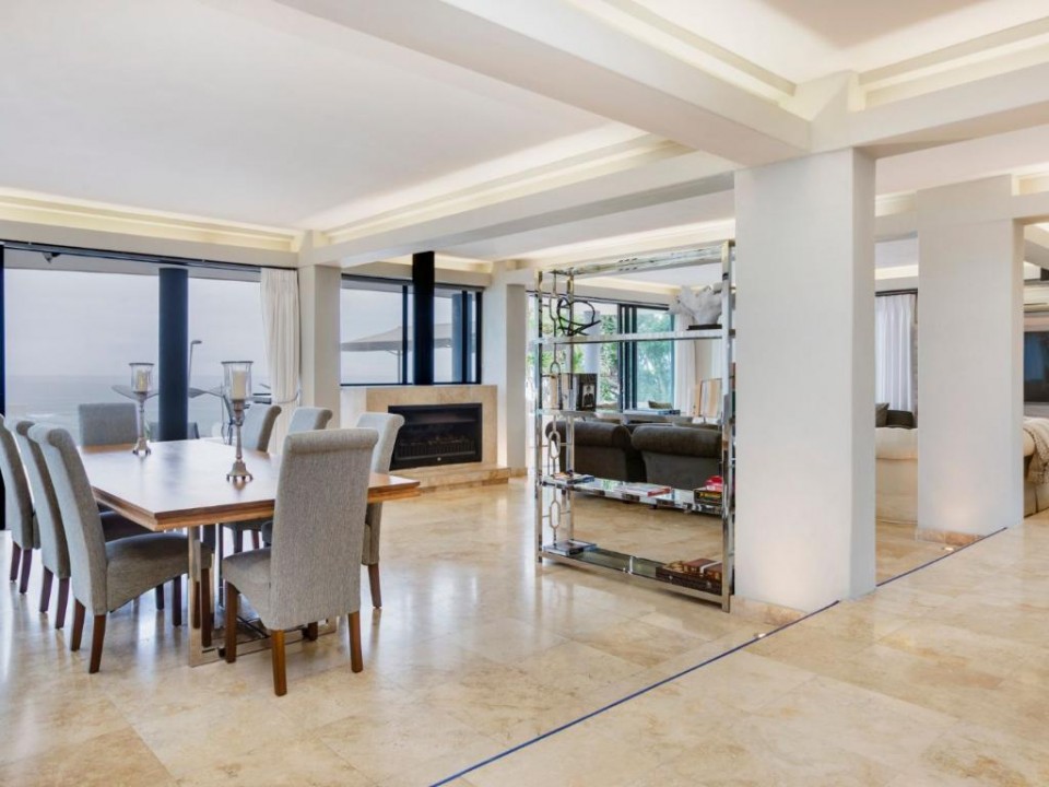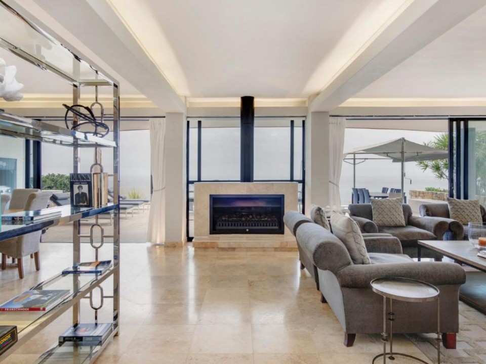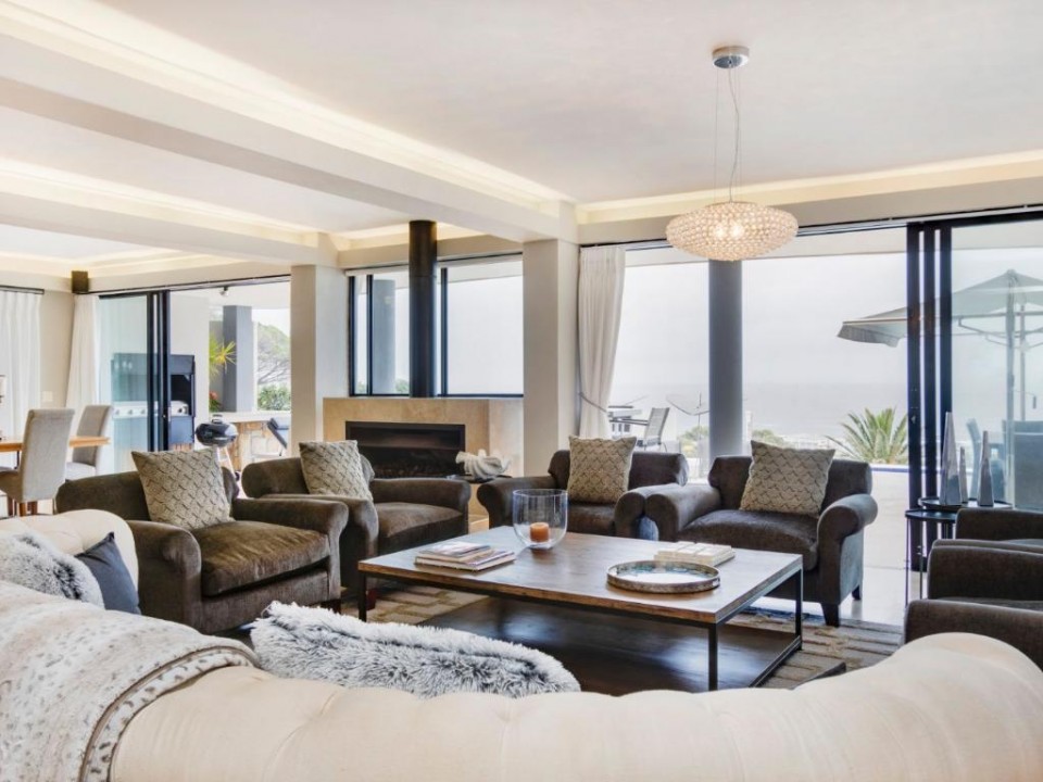Floor-to-ceiling glass captures sweeping sea and mountain views, creating a seamless connection between indoor living and the natural beauty of the Atlantic Seaboard. The open-plan living area offers generous lounge seating, a large TV with surround sound, formal dining for eight, and a feature fireplace — all opening onto a private entertainment deck with a pool.