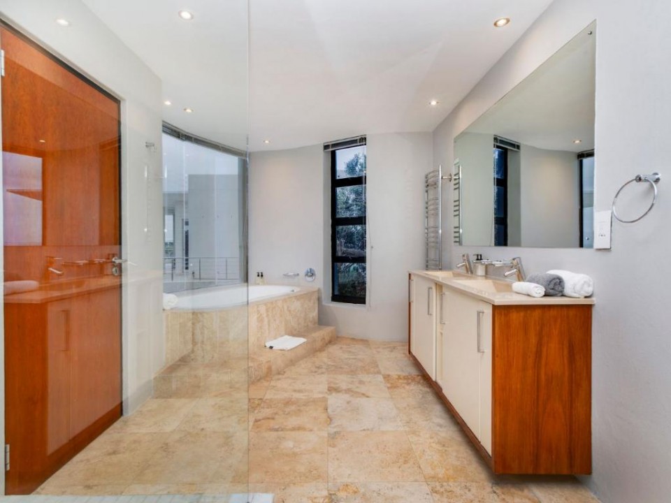 The spacious en-suite features a spa bath overlooking the ocean, large shower with jets, double vanity, heated towel rails, bidet, and toilet. -