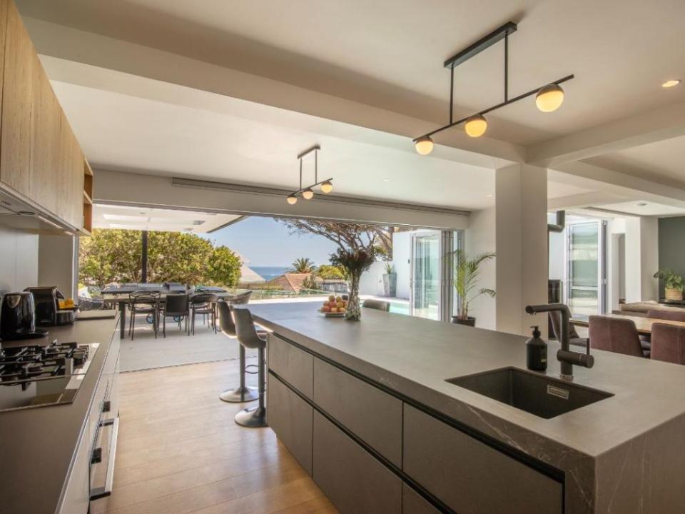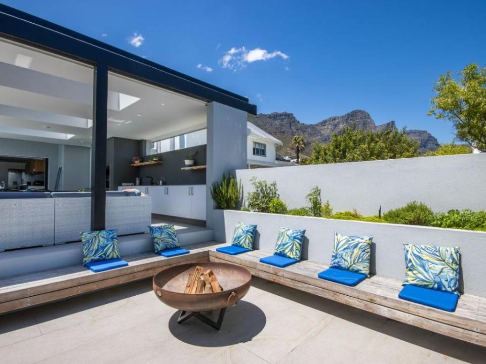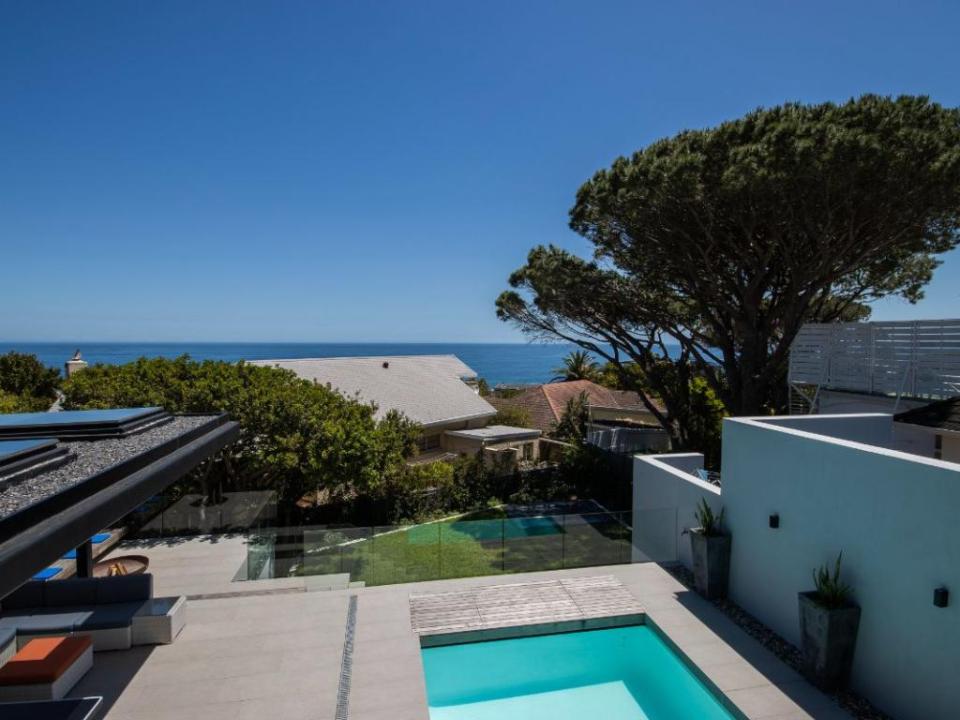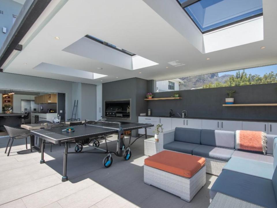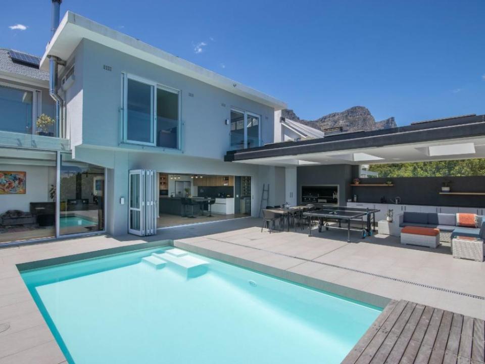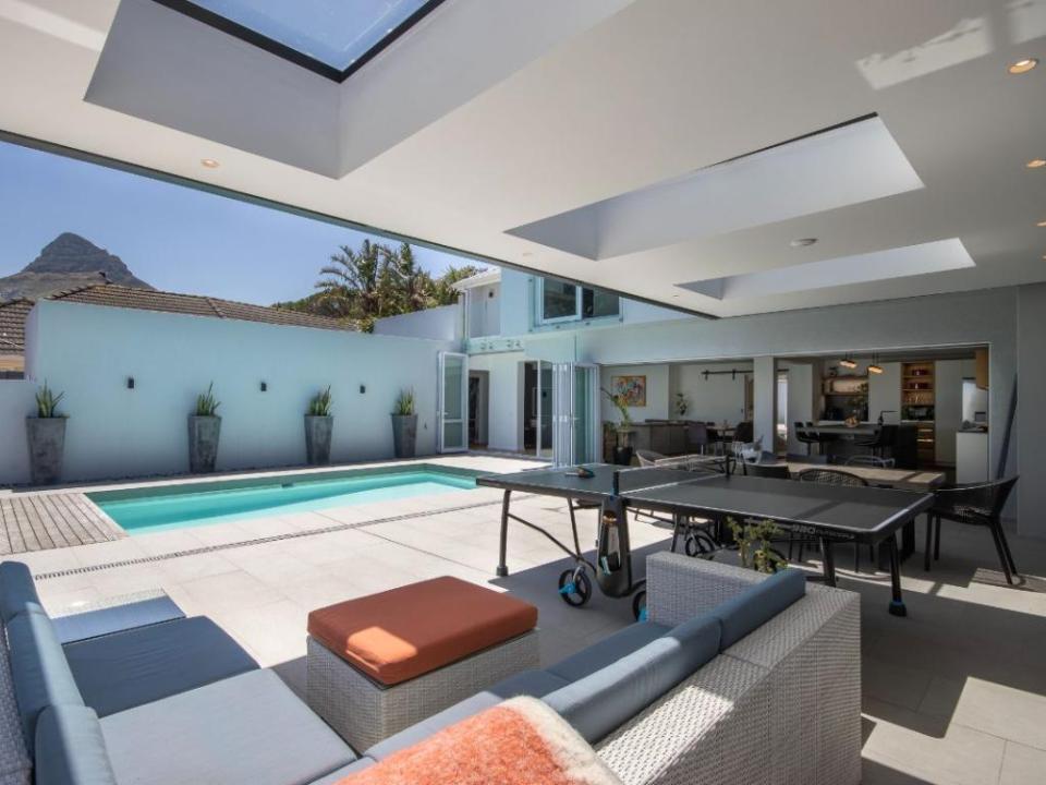 With spacious open plan interiors and modern decor, this lovely 4 bedroom family home in Camps Bay is a perfect base for a beach vacation. The lower level of the house is the open plan kitchen, dining, lounge and covered outside entertainment area, which includes a table tennis table. The deck has a private pool, barbeque area and partial sea views. There are 4 bedrooms and 4 bathrooms, with the master suite having a generous sized walk through cupboard and access to the balcony with sea views. 2 of the other 3 bedrooms also have balcony access and sea views.