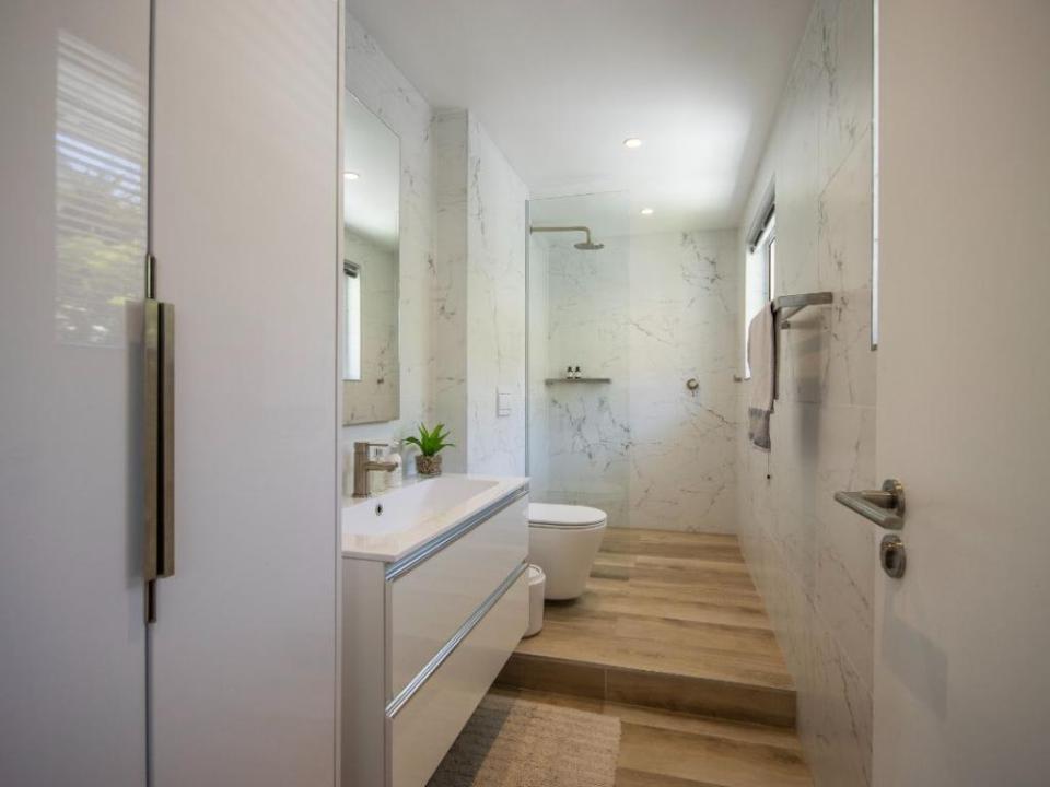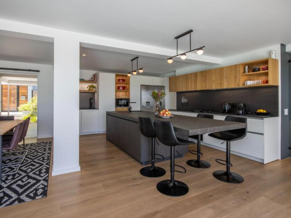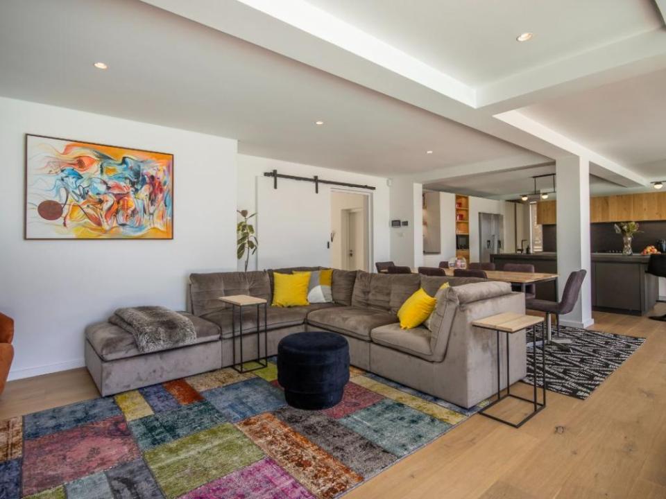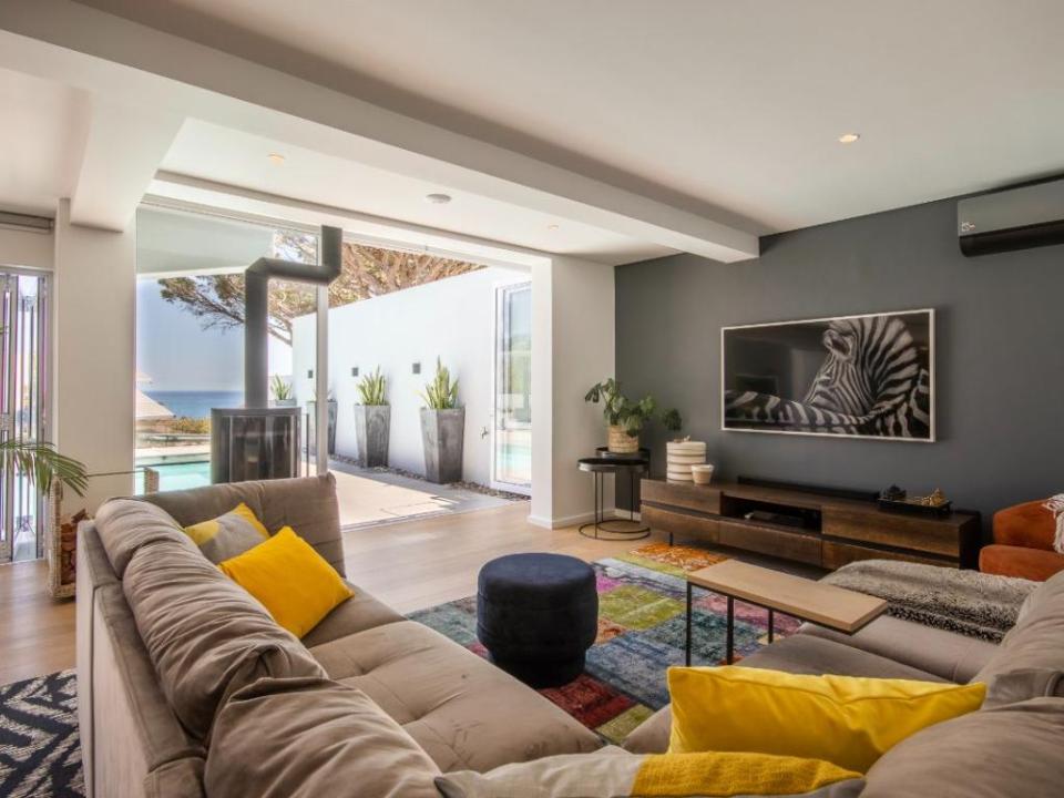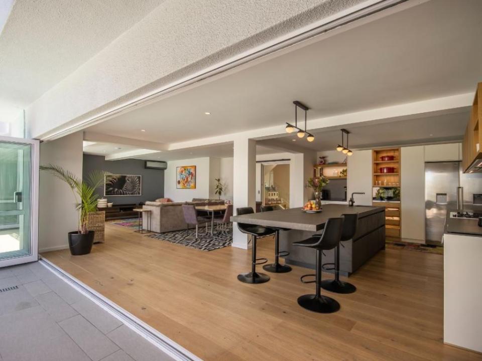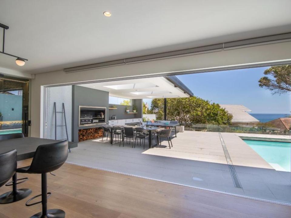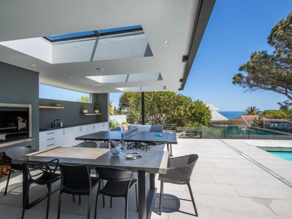 With spacious open plan interiors and modern decor, this lovely 4 bedroom family home in Camps Bay is a perfect base for a beach vacation. The lower level of the house is the open plan kitchen, dining, lounge and covered outside entertainment area, which includes a table tennis table. The deck has a private pool, barbeque area and partial sea views. There are 4 bedrooms and 4 bathrooms, with the master suite having a generous sized walk through cupboard and access to the balcony with sea views. 2 of the other 3 bedrooms also have balcony access and sea views.