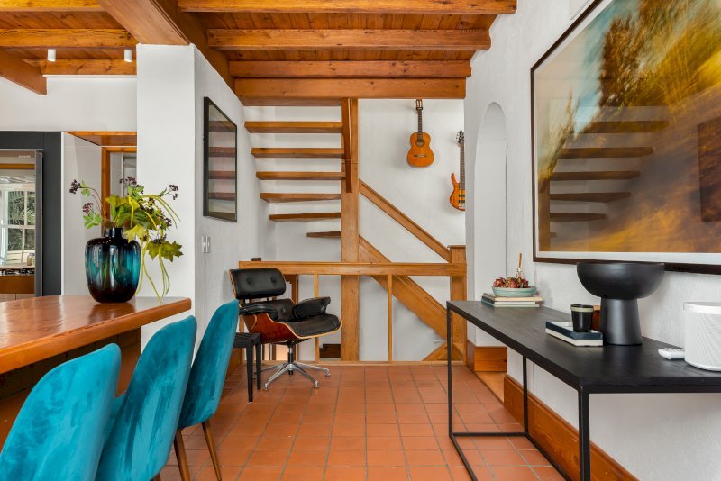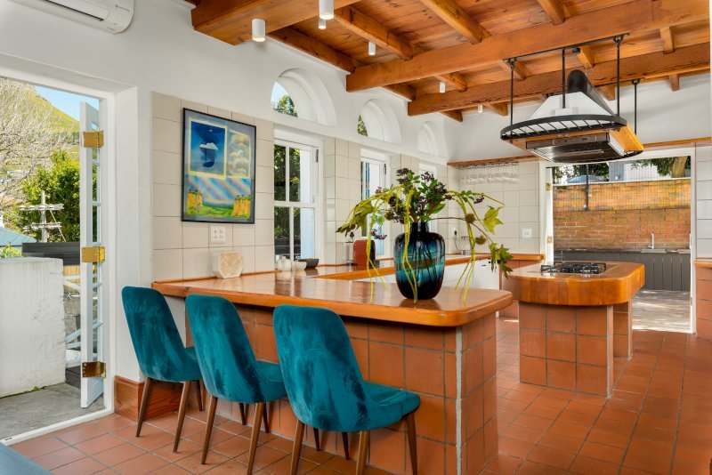 Up the stairs to the main level you will find a dining room with loads of natural light and a combustion fireplace for evenings where you want to create a cosy dining experience. The double volume lounge area with a fireplace and carefully curated art is on the same level as well as a large kitchen that leads to an outside patio with a braai.