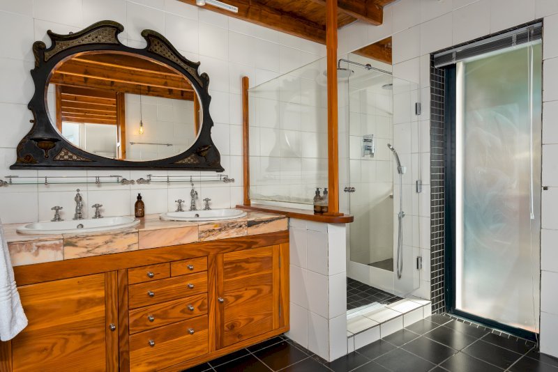 Also on the main level you will find the main bedroom complete with a canopy bed, views over the city bowl and doors to the patio to let in fresh air. The ensuite bathroom offers a walk-in shower and oversized tub with marble finishes and a double basin completing the space.